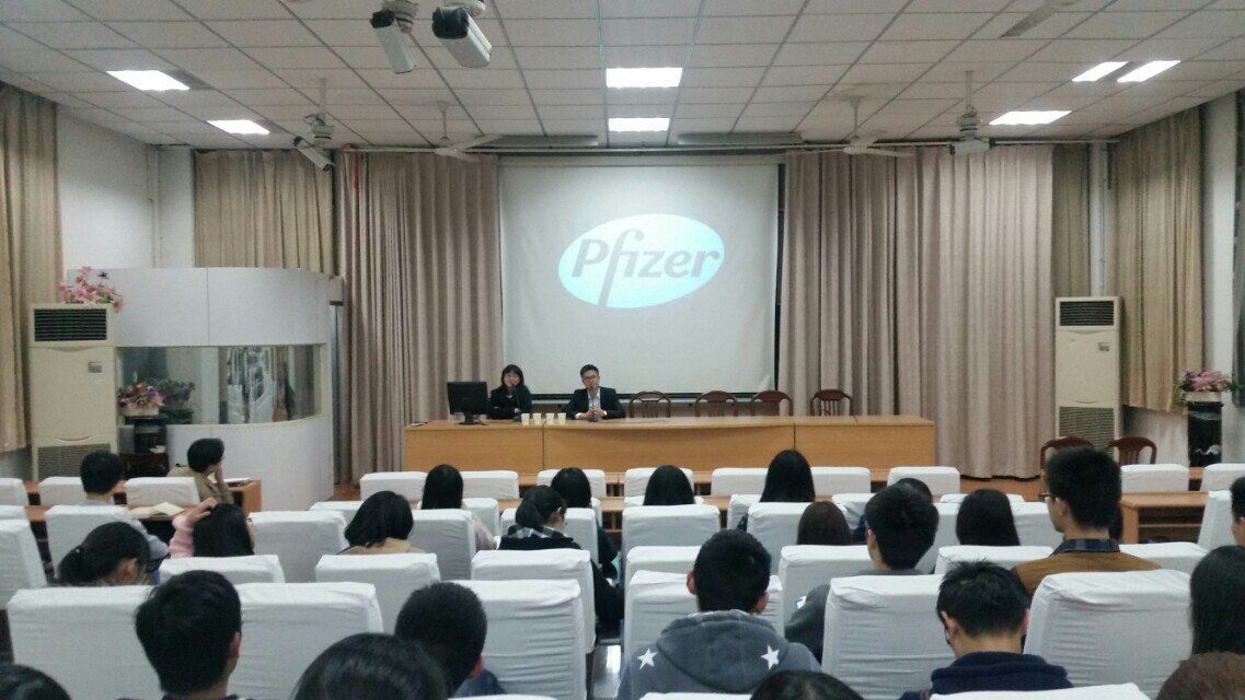 宣讲会首先由辉瑞驻江苏地区经理褚迪波发言。褚经理介绍了公司创建历史、产品品类、中国分部发展历程等,让同学们对辉瑞公司有了基本的了解。接着,公司专员陆帅对公司的主营业务进行了简单讲述,阐明了中国医疗需求旺盛,医药市场潜力巨大的行业前景。第三位专员万小燕则别出心裁地播放了公司的宣传视频,幽默地介绍了公司的福利待遇及职员生活。接着,是由工作不久但已崭露头角的优秀职员葛腾,分享他的成功经验。他以亲身的经历告诉了同学们求职和工作的一些宝贵经验。即使是优秀的葛腾,也仍然经历了四次面试,才敲开了工作的大门。“不是要告诉公司你的能力,而是要了解公司需要什么。”他以过来人的经验总结了这一句话。