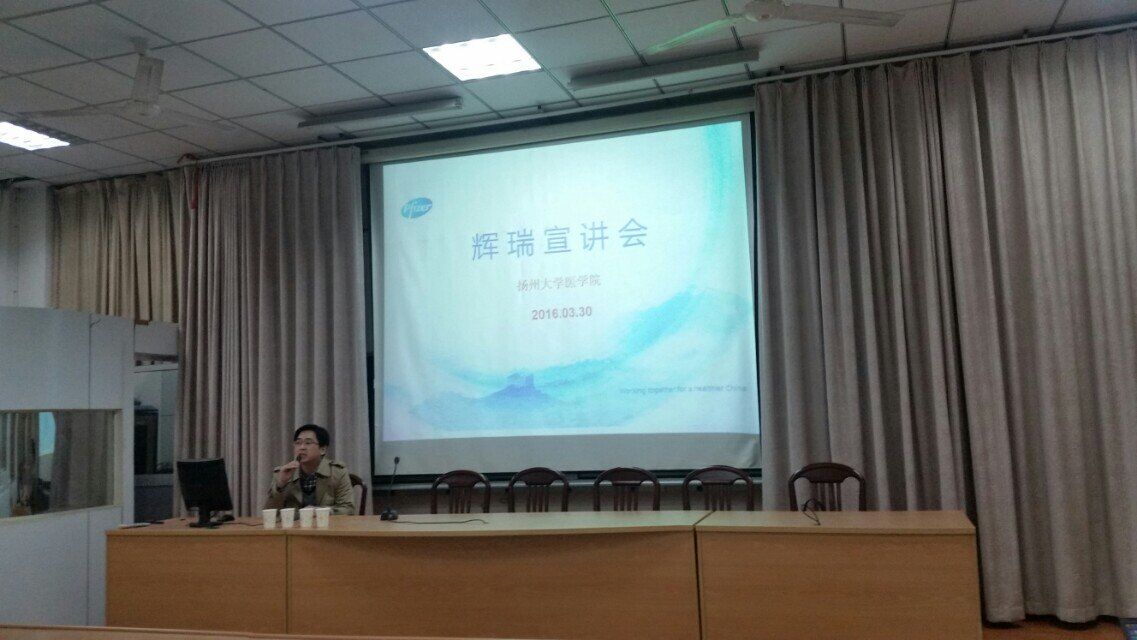 3月30日晚6点30分,扬医药学系联合辉瑞制药有限公司于医学院报告厅举办了校园招聘宣讲会。会议由辉瑞公司工作人员主持,药学系辅导员王安庐老师出席。辉瑞制药有限公司是世界医药的龙头企业,有着悠久的历史和深厚的实力。这一次也是辉瑞公司第一次来到扬大进行宣讲,对于药学系学生来说是难得的学习和求职机会。