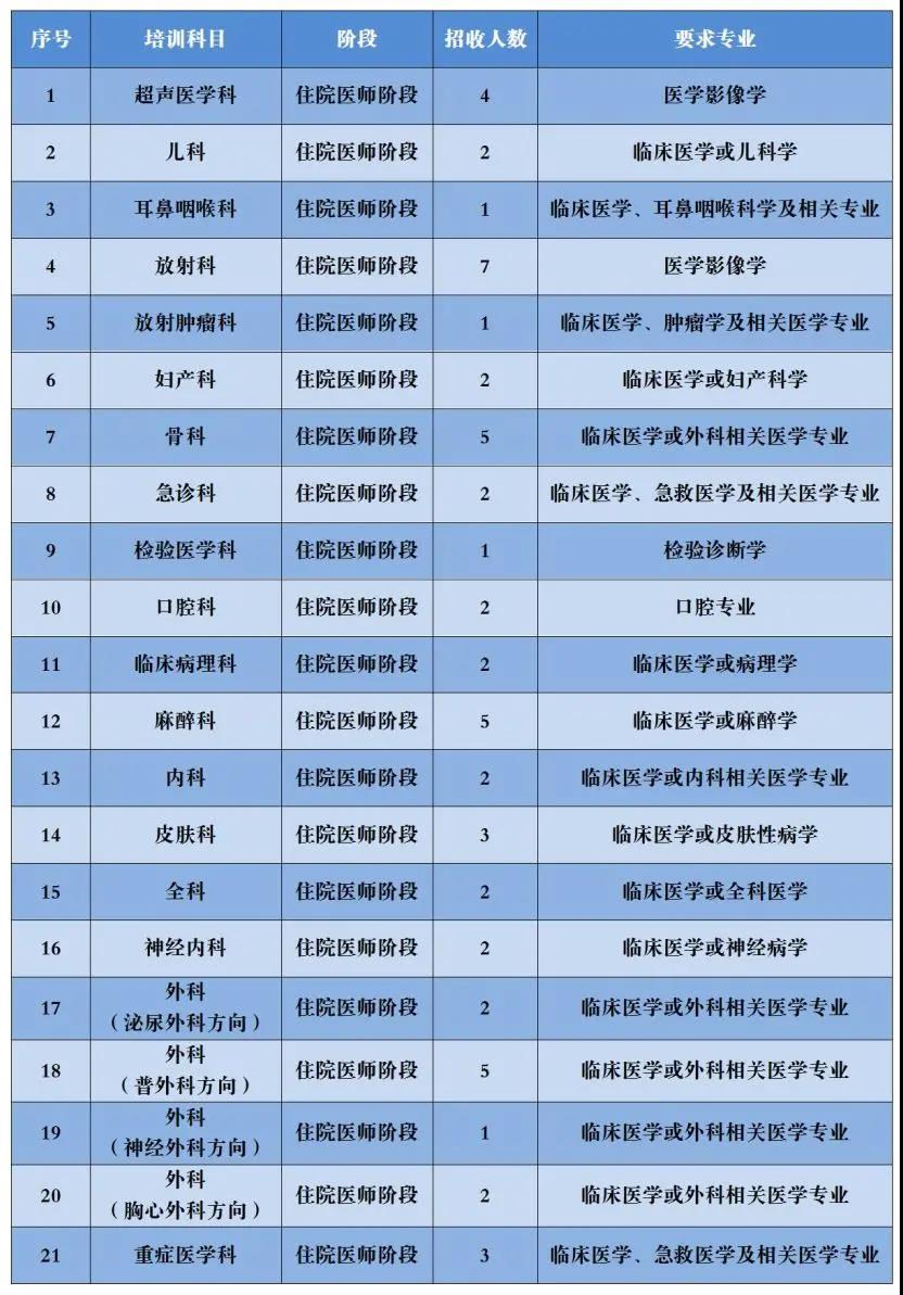为深入贯彻《国家卫计委等7部门关于建立住院医师规范化培训制度的指导意见》【国卫科教发〔2013〕56号】、《国务院关于建立全科医生制度的指导意见》【国发(2011)23号】等文件精神,主动适应国家基本医疗卫生服务人才需求,培养合格临床医师,现决定面向社会招收2021年度住院医师规范化培训学员,具体事项如下: