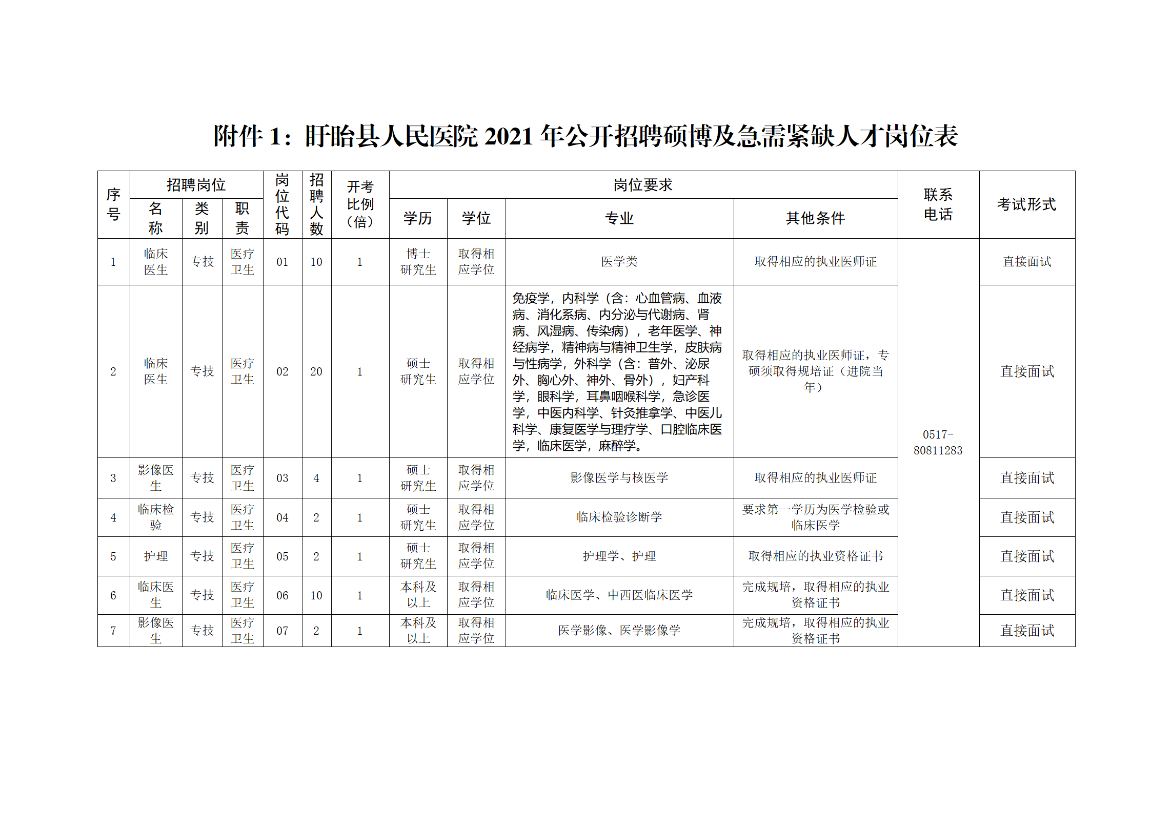 江苏省盱眙县人民医院定于2021年6月11日(星期五)上午举行硕博及急需紧缺人才专场招聘会,招聘形式为面试,医院安排食宿,报销往返路费(原则上1000元以内)。请有意参加的同学及时与盱眙县人民医院人事科联系,方便为各位提前安排食宿。
