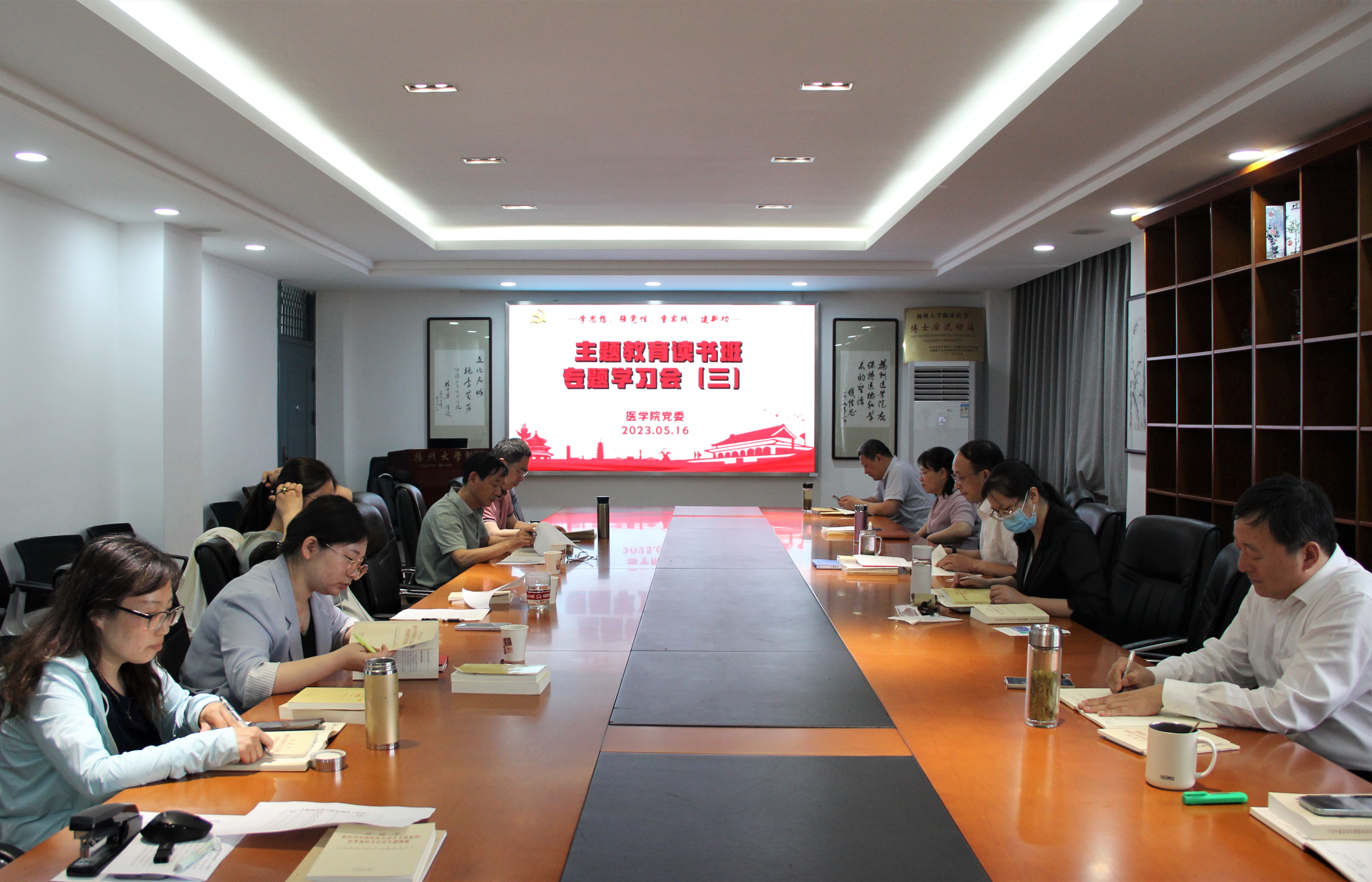 2023年5月16日,医学院党委理论学习中心组举行学习贯彻习近平新时代中国特色社会主义思想主题教育读书班第三次集体学习会,学习研讨了《习近平新时代中国特色社会主义思想学习纲要》和《习近平新时代中国特色社会主义思想的世界观和方法论专题摘编》的部分内容。