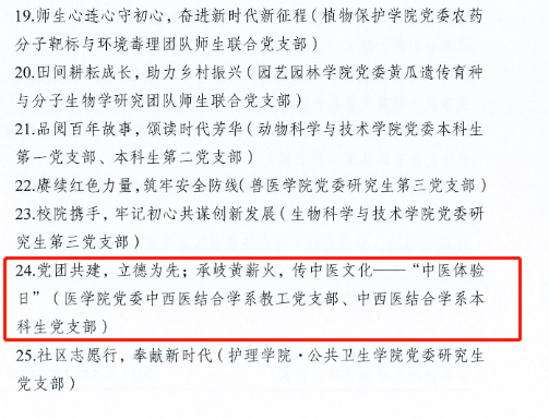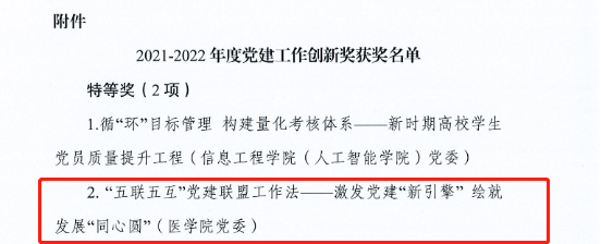 近日,校组织部公布2021-2022年度党建工作创新奖评选结果,院党委申报的《“五联五互”党建联盟工作法——激发党建“新引擎” 绘就发展“同心圆”》项目获党建工作创新特等奖。同时中西医结合学系党总支申报的《党团共建,立德为先;承岐黄薪火,传中医文化——“中医体验日”党日活动》获评“最佳党日活动”优胜奖。