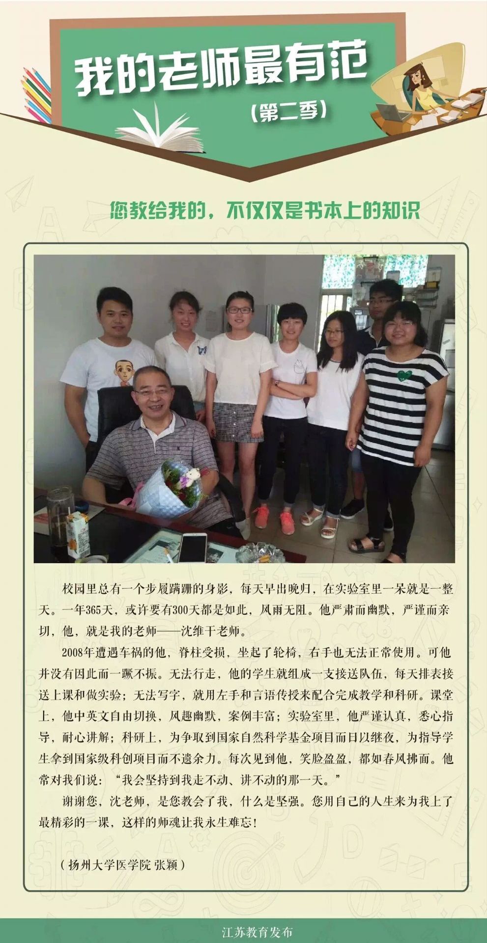 江苏省教育厅官方微信《江苏教育发布》9月21日推出主题活动——我的老师最有范(第二季):您教给我的,不仅仅是书本上的知识。导语称:他们是一群普通人,每日在校园里穿梭,备课、教学、与学生交流;他们又是一群不普通的人,教书育人不仅是一份工作,更是承担起了为国家、为未来培育人才的重任。他们教给学生的,不仅仅是书本上的知识,更有做人的道理、拼搏的精神。本期推出的第一位老师便是我院博士生导师沈维干教授。