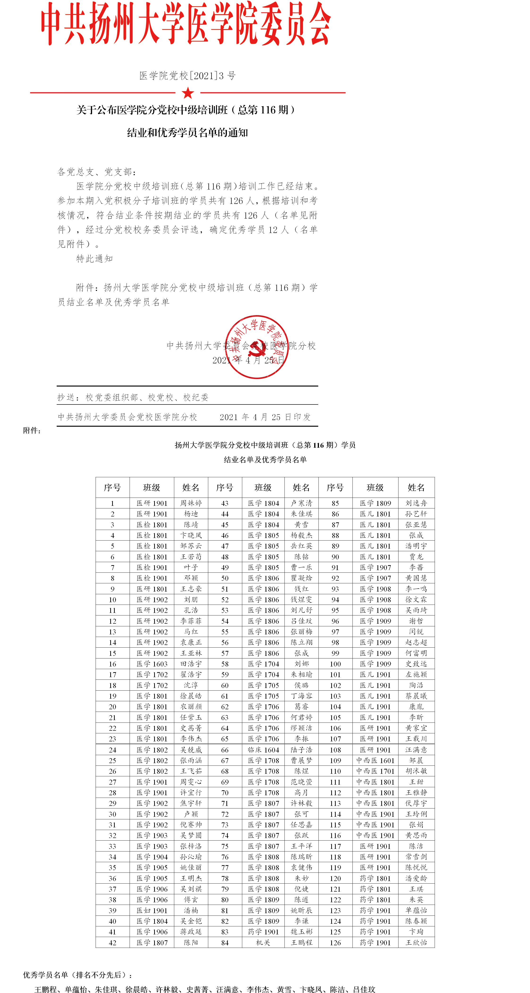 关于公布医学院分党校中级培训班(总第116期)结业和优秀学员名单的通知