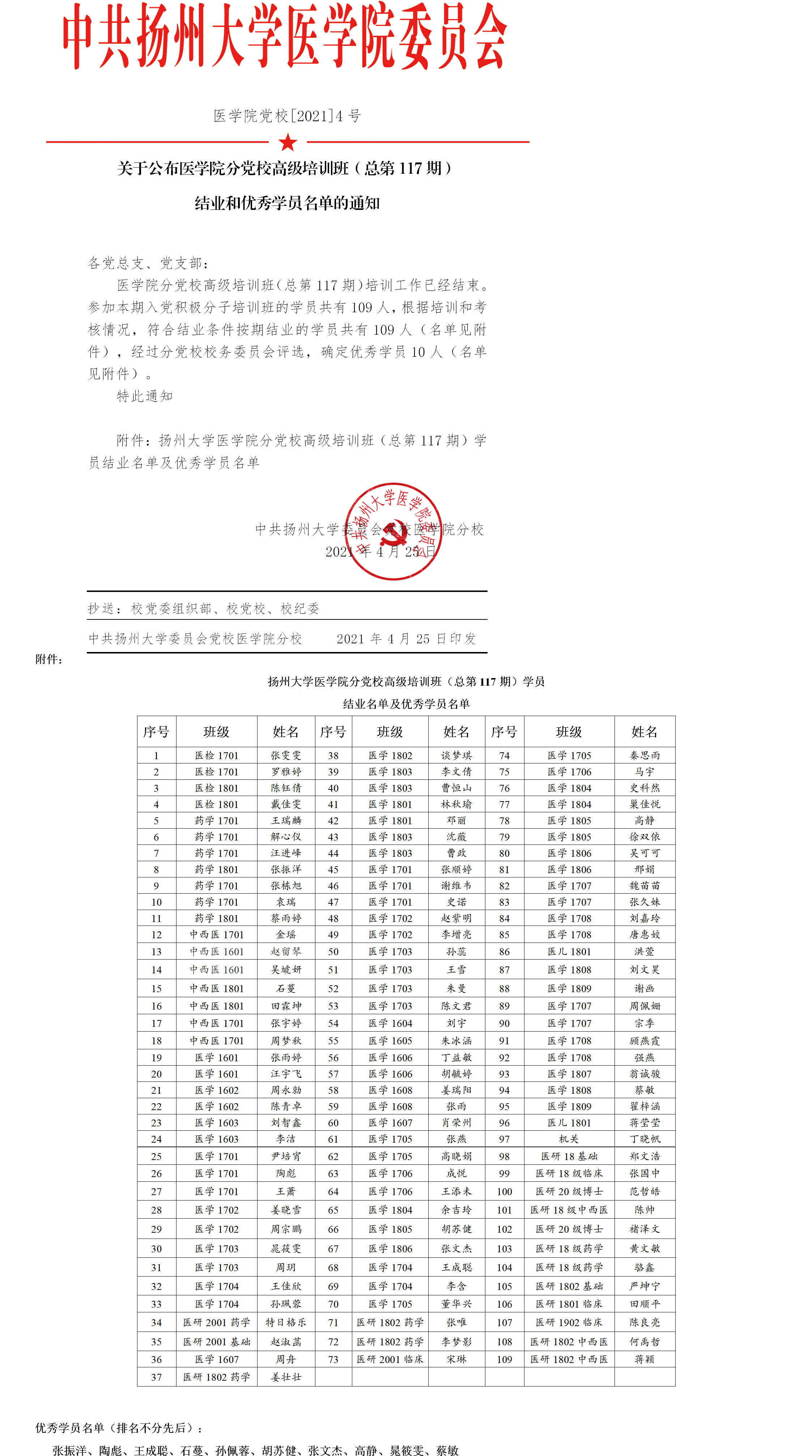 关于公布医学院分党校高级培训班(总第117期)结业和优秀学员名单的通知