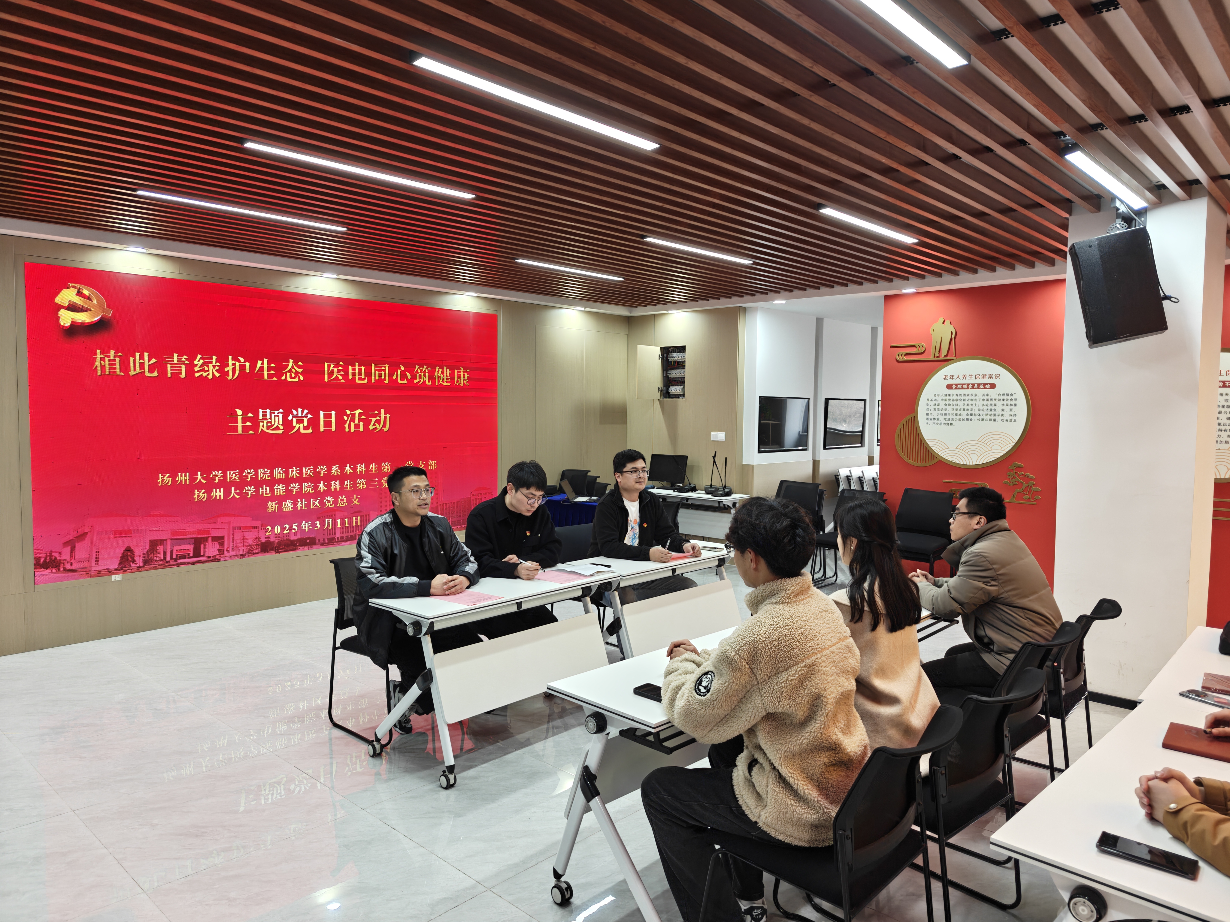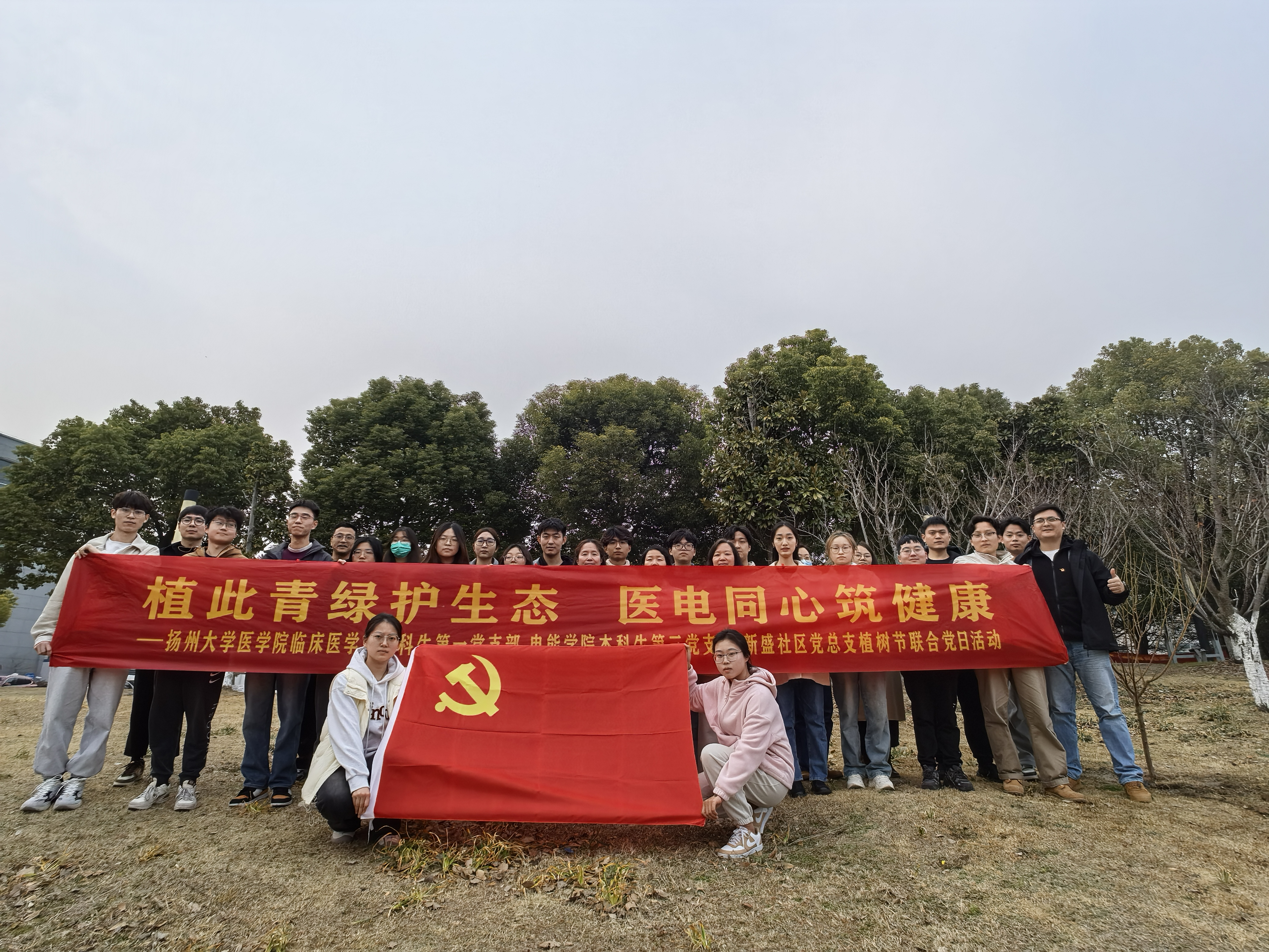 2025年3月11日,扬州大学医学院临床医学系本科生第一党支部、电能学院本科生第三党支部与新盛社区党总支联合开展“植此青绿护生态 医电同心筑健康”植树节主题党日活动。活动紧扣生态文明建设与基层健康服务主题,通过支部共建、知识宣讲、志愿服务等形式,切实将党建优势转化为服务群众的实际行动。