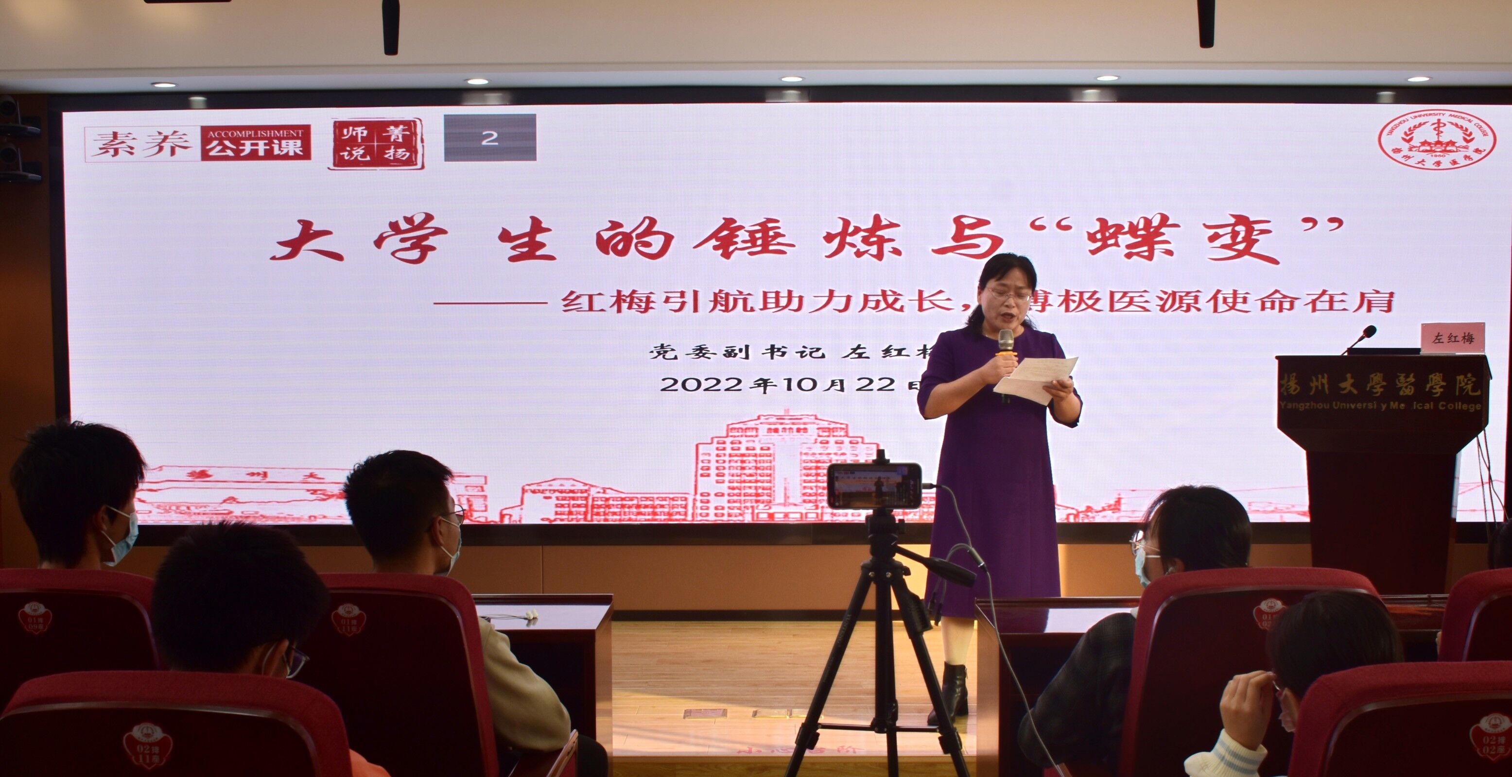 为了引导大学新生树立正确三观,培养医学生的家国情怀,10月22日下午,我院举办主题为《大学生的锤炼与“蝶变”——红梅引航助力成长,博极医源使命在肩》的素养公开课,由院党委副书记左红梅老师主讲,院团委书记许金鑫老师主持,学院辅导员及22级全体本科新生参加活动。左红梅书记围绕大学生的理想与信念、塑造与锤炼以及提升与“蝶变”三个方面开展,为大学生的健康发展和个人成长指明了方向,让同学们明确了奋斗的意义。