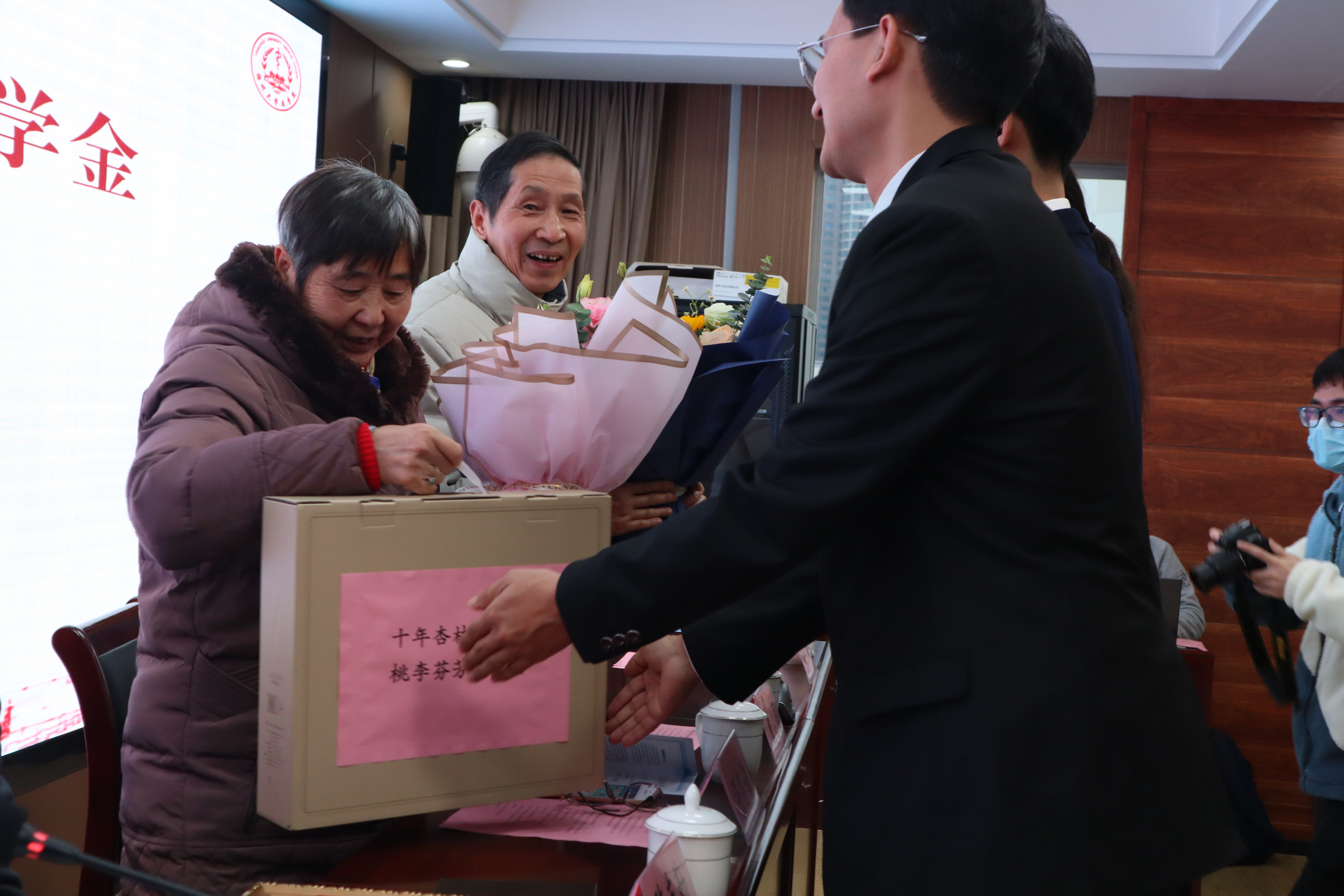 校对外联络办公室、扬州大学教育发展基金会办公室主任陈克勤老师代表扬州大学教育发展基金会向捐赠单位代表颁发了捐赠证书并赠送扬州大学“强怀娣奖助学金”项目十周年感恩回顾画册。