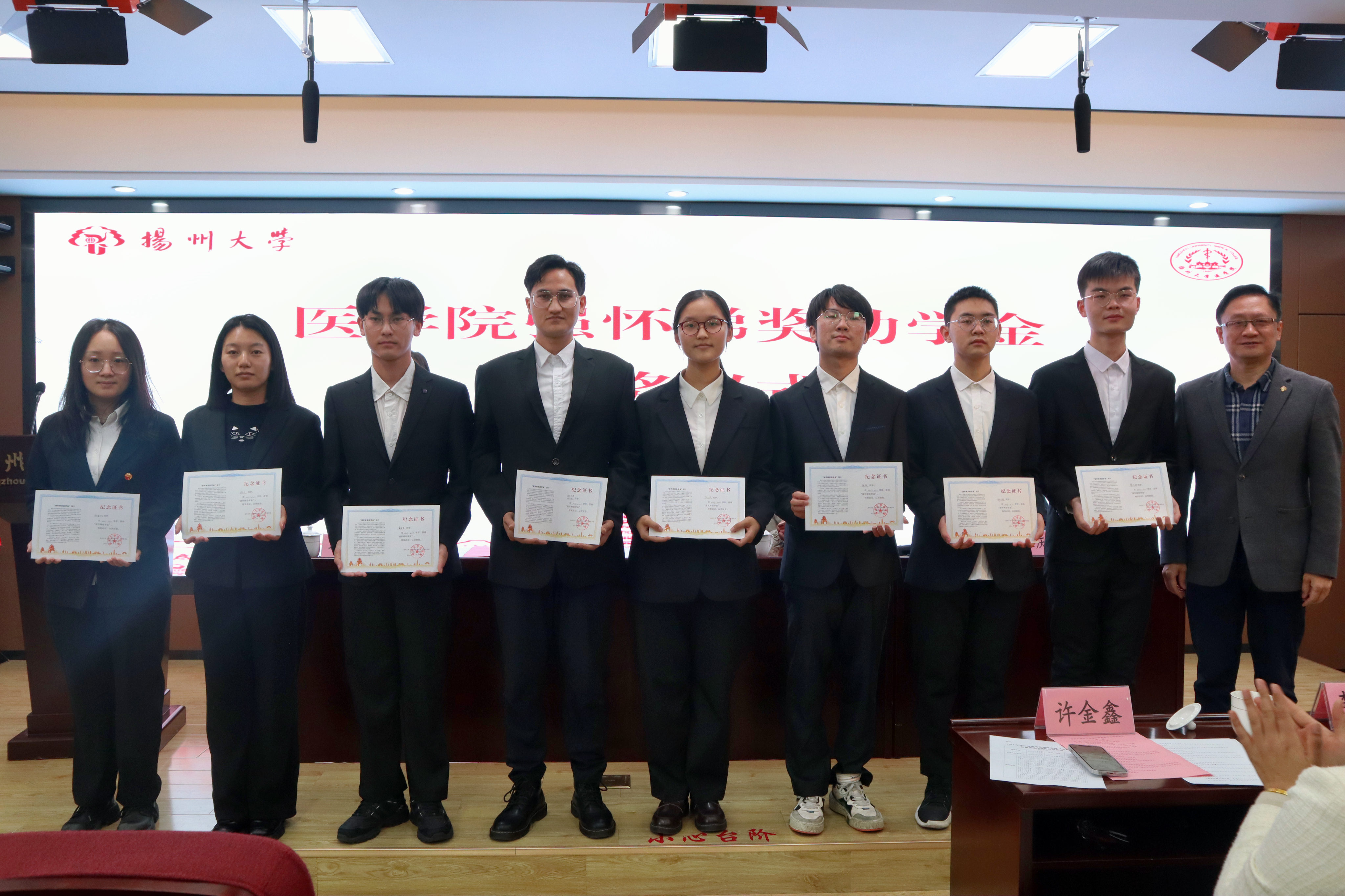 在全校上下深入学习宣传贯彻党的二十大精神和学校第四次党代会精神之际,我院隆重举办了扬州大学医学院“强怀娣奖助学金”颁奖典礼。“强怀娣奖助学金”冠名者、我院退休教师强怀娣,强怀娣老师爱人、我校原统战部副部长戴占军,校对外联络办公室、扬州大学教育发展基金会办公室主任陈克勤,院党委书记王庆林,院团委书记许金鑫出席典礼,院党委副书记左红梅主持活动。