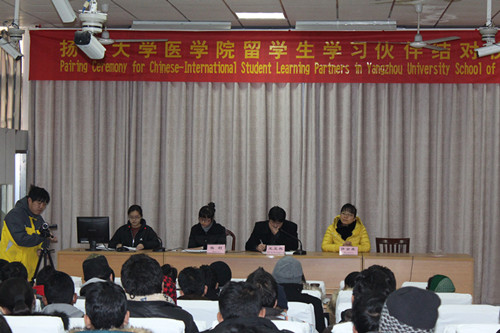 2013年12月19日,医学院在院报告厅成功举行了2012级留学生学习伙伴“1+1”结对仪式。医学院副院长王正兵、留学生办公室主任孙茂庆、留学生办公室副主任钱莉、团委学工办副主任徐金鑫及留学生班主任出席了本次结对仪式。