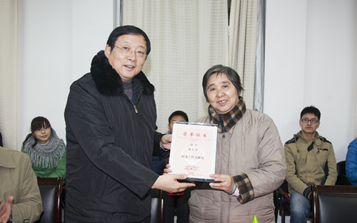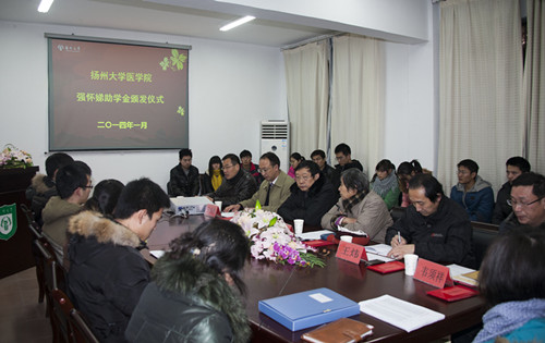 1月11日下午,“扬州大学医学院强怀娣助学金”颁发仪式在我院举行。校党委副书记、纪委书记刘延庆出席会议,校对外联络办公室负责同志、助学金冠名者强怀娣老师、学院有关领导和学工办全体老师以及50名获得资助的学生参加了仪式。颁发仪式由院党委书记王炜主持。 “扬州大学医学院强怀娣奖助学金”是由我校杰出校友、泰格医药科技股份有限公司董事长叶小平2012年捐资,并用其班主任强怀娣老师的姓名进行冠名设立的,连续两年总计捐资40万,用于奖励我院品学兼优的本科生和研究生。在颁奖仪式上,校党委副书记、纪委书记刘延庆代表学校向资助方颁发了捐赠证书,向强怀娣颁发了“校友工作贡献奖”纪念牌。在讲话中,他首先向捐赠单位、校友及其代表表达了谢意。他在对获奖同学表示祝贺的同时,希望同学们要学会感恩,要对“感恩”进行深层次的思考,他指出:校友的资助其实是代表了社会对于学子的关爱,要深刻地理解这份感恩之情,作为医学生更要去感悟和诠释这份感恩之情。他希望同学们要树立高尚的品德,社会宣扬的道德对于医学生来说应当是最基本的,对于医生而言,道德的要求应当更高,医学生更应当学会去关爱他人,关心患者,坚守道德底线。他希望同学们能够好好学习,他表示一个好的医生不能只有爱心,更要有精湛的医术,这样才能胜任医生这个神圣的职业。 颁奖仪式上,院党委副书记陈轶群首先介绍了强怀娣奖助学金及其评审情况,校对外联络办公室主任王庆林宣读了2013年度“强怀娣助学金”资助名单,并向强怀娣赠送了《扬州大学校友会会刊》。在颁发了助学金后,强怀娣老师用简短而真挚的语言表达了对受助学生的勉励和希望。受助学生代表何瑞丽同学汇报了自己学习生活情况,并表达了感恩之情和继续好好努力的决心。仪式最后,与会师生亲切合影留念。