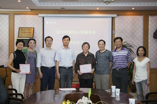 5月26日下午,医学院在院会议室举行了兼职心理辅导员聘任仪式及重点关注学生会商研讨活动。校学生处副处长、校心理健康教育中心主任周春开应邀到会并讲话。院党委副书记陈轶群,院关工委、学工办、心理协会的师生代表,以及有关班主任参加了活动,院团委书记王芬主持了聘任仪式。