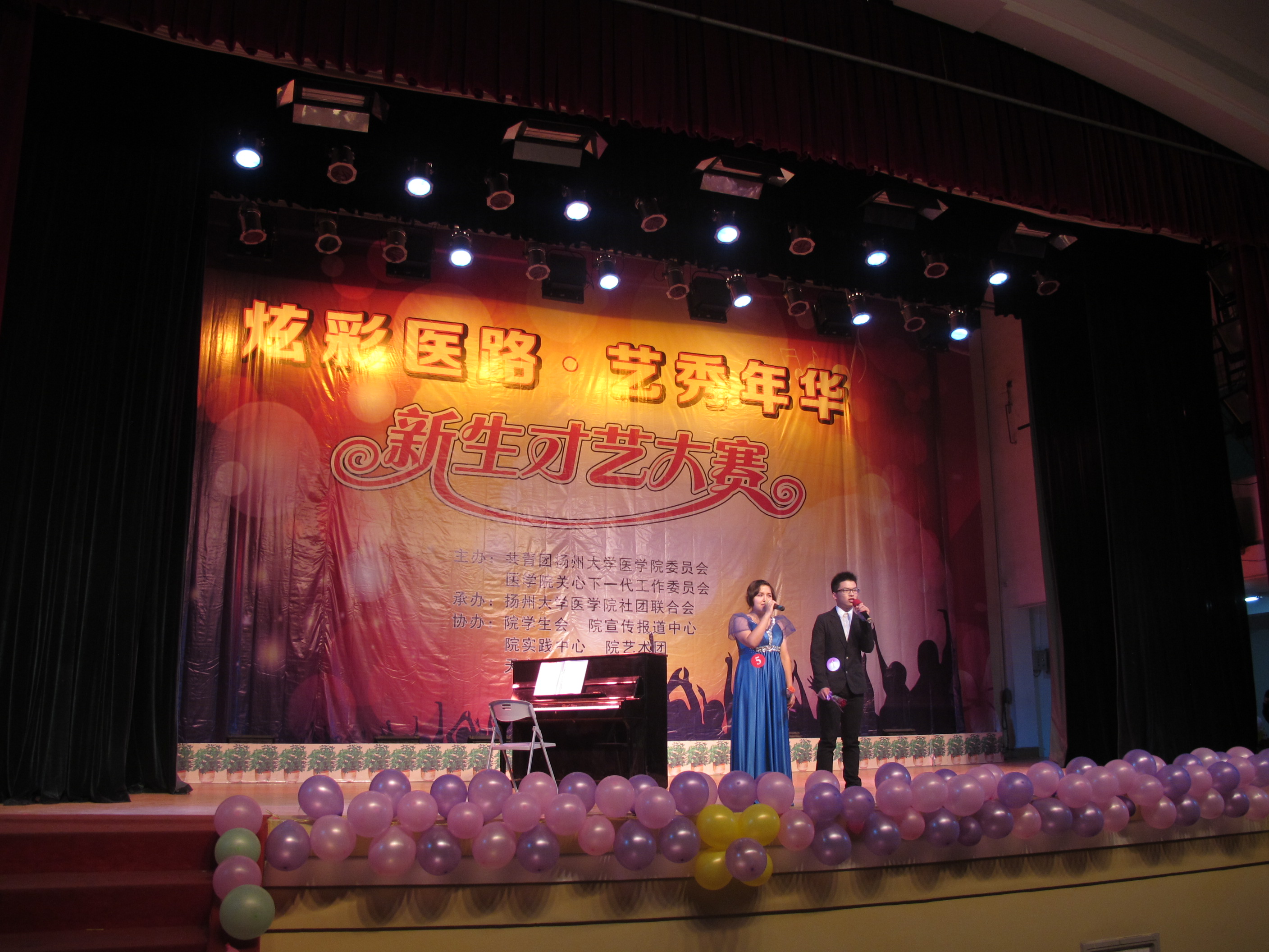 青春弱冠展风采,扬医新生奏华章。11月16日晚,扬大医学院2014级新生才艺大赛在农学院大礼堂如火如荼的进行。到场的嘉宾有院党委书记王炜、党委副书记陈轶群、各系负责人与班主任老师,以及扬州电视台的相关负责人。大赛还未开始,大礼堂已座无虚席。