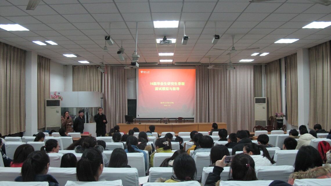 2016年3月8日晚上7点,在医学院报告厅举办了16届毕业生研究生录取面试模拟与指导,院长史宏灿、院党委副书记陈轶群及各系面试导师参加了辅导活动。活动环节包括现场模拟面试及专家点评、院长指导环节、去年调剂和录取成功的学长经验介绍。即便晚上下着大雨,报告厅里也座无虚席。