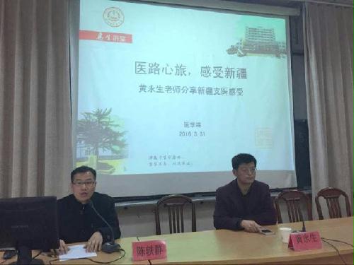 3月31日下午4点,扬州大学医学院惠生讲堂首次开讲。本次讲堂邀请援疆医生黄永生老师主讲,院党委副书记陈轶群主持,15、14级临床专业学生参加了本次讲座。