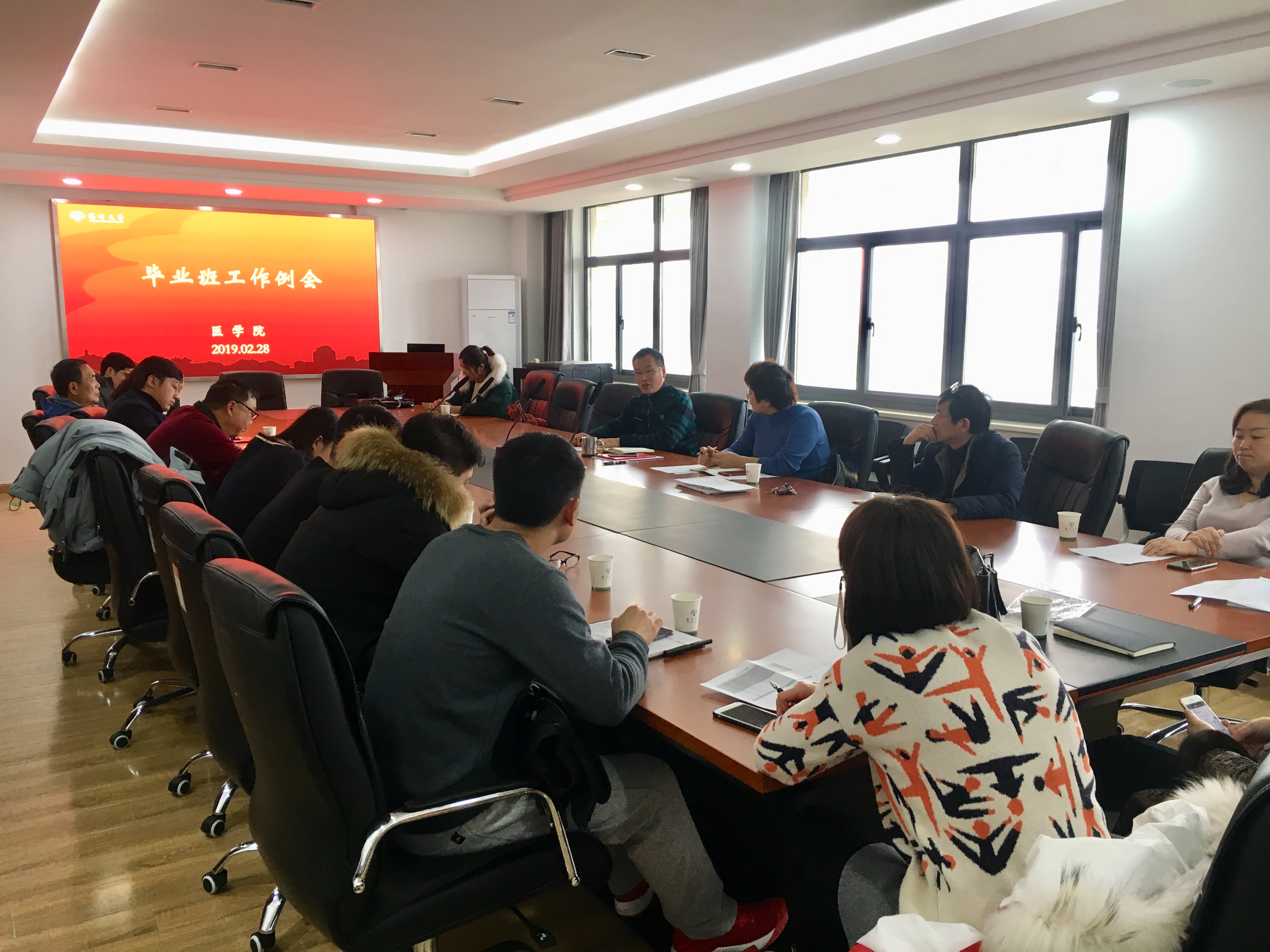 2月28日下午16点,医学院在江阳路北校区19号楼810会议室召开毕业班班主任例会,会议由院党委副书记陈轶群老师主持,全体毕业班班主任以及院全体辅导员出席参加。