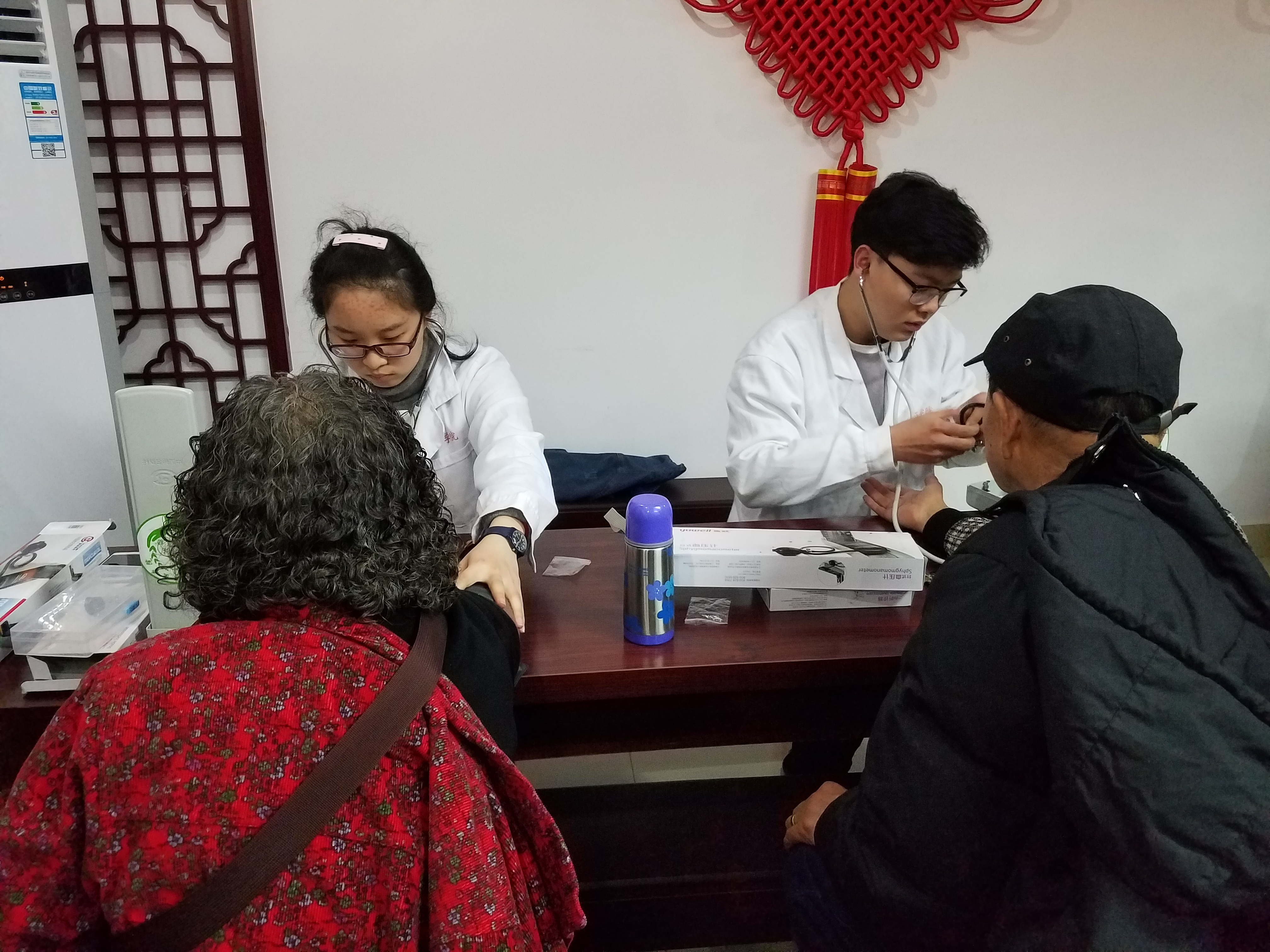 讲座结束后居民们分别进行了血压测量和旧药换新药的活动。大家很喜欢这个环节,纷纷拿出自己带来的药物换取我们提供的家常必备药品,场面十分热闹,参与旧药换新药的居民可以参与抽奖,从中产生的幸运居民获得了我们专门提供的装有家中常备药材的小药箱。还有一些居民到我们的义务量血压处测量血压,临床系的两位学生非常有耐心的接待了每位居民,并且针对他们的血压测量结果给他们提供了一些建议,对于刚刚运动过血压不太稳定的老人,他们细心地让其休息十分钟在进行测量,这样测量的结果更加准确。