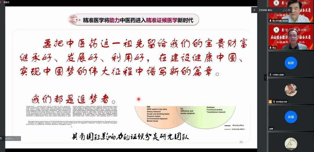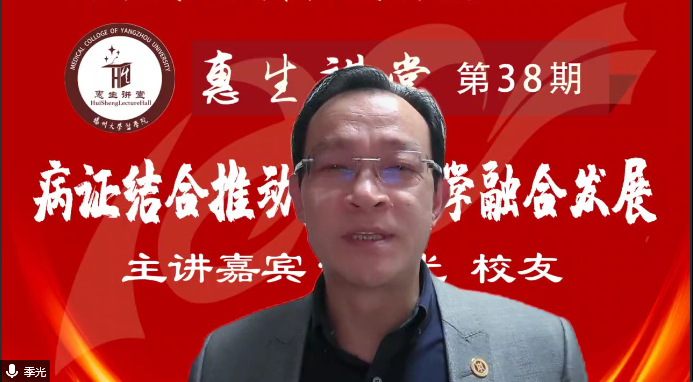 5月18日下午,医学院第38期惠生讲堂在线上开讲,首届国家岐黄学者、我院1991届校友季光教授应邀作客本次讲座。讲座由医学院院长史宏灿主持,院党委副书记花瑞锋,副院长颜丙春,中西医结合学系领导、教师代表、本科生和研究生参与讲座。讲座通过线上腾讯会议的形式进行直播,同时在“扬州大学医学院”官方B站平台进行联动播出。