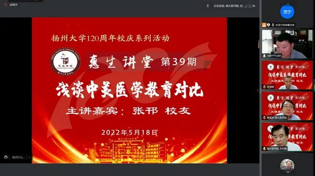 5月18日晚,医学院第39期惠生讲堂在线上开讲,我院1980届校友张邗应邀作客本次讲座。讲座由医学院院长史宏灿主持,院党委书记王庆林、党委副书记花瑞锋,转化医学研究院常务副院长梁景岩,教师代表、本科生和研究生参与讲座。讲座通过线上腾讯会议的形式进行直播,同时在“扬州大学医学院”官方B站平台进行联动播出,600余名师生在线观看。