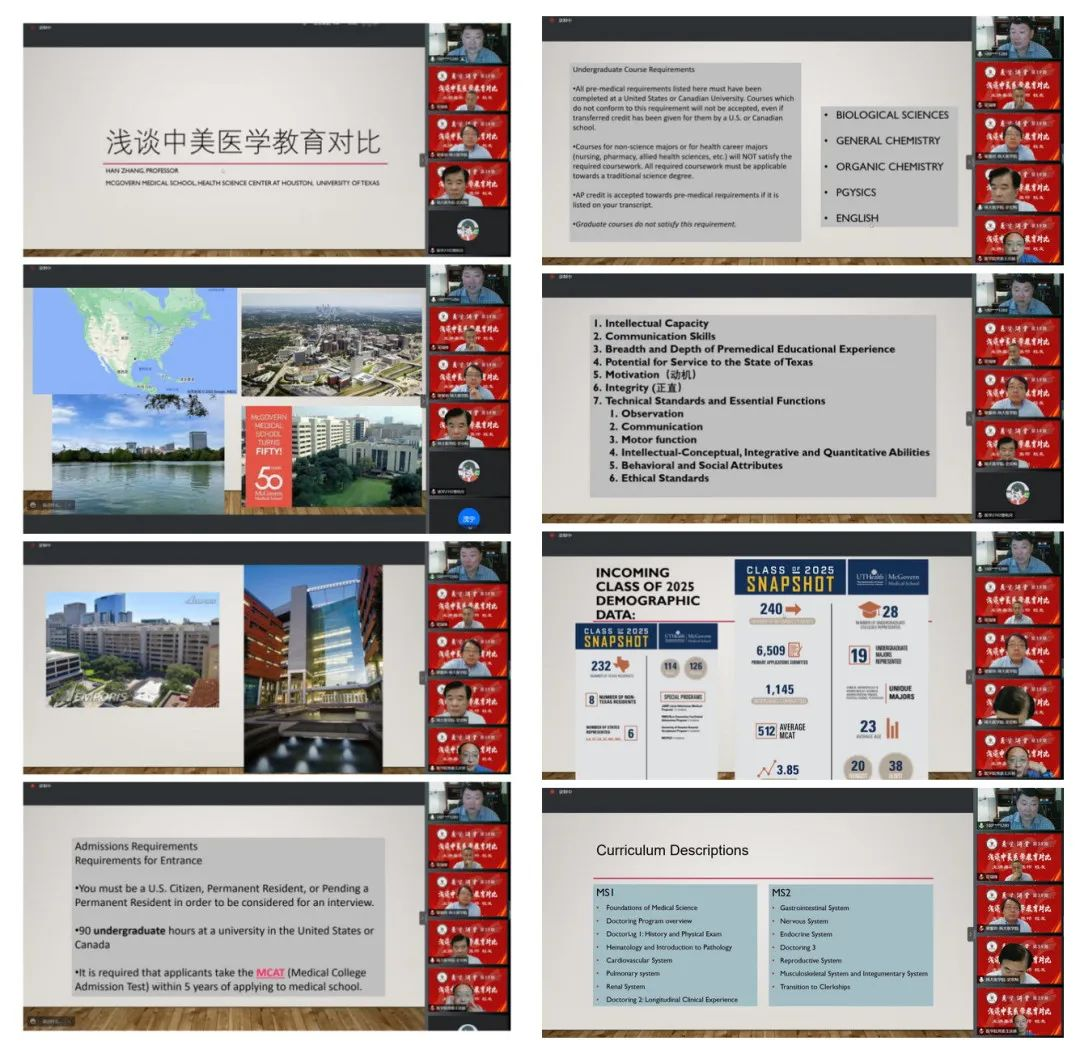 “浅谈中美医学教育对比”为题,张邗校友与师生分享了他眼中中美两国医学教育的差异。他以德克萨斯大学麦戈文医学院为例,用详实的数据、生动的案例及其本人教学心得,从招生方式、教学模式、课程设置、教学过程、学生职业发展规划等方面对比了中美医学教育的差异。张邗校友表示,美国医学教育注重学生的参与度、有大量的医学模拟教育课程,让学生很早就接触病人,以综合考试为主,同时也非常注重医学生人文素质和职业道德的培养。他还向同学们介绍了自己所在学校的情况和自己日常的教学工作。讲座过程中同学们就国内外医学教育的疑惑以及如何提升自己等问题踊跃提问。医学院教师代表也就教学改革及教材建设等问题与张邗校友进行了探讨。