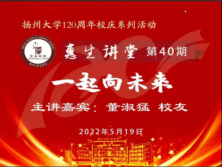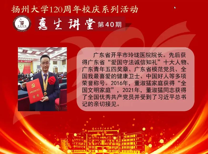5月19日下午,医学院第40期惠生讲堂在线上开讲,全国优秀共产党员、我院1999级校友董淑猛应邀作客本次讲座。讲座由医学院党委书记王庆林主持,院党委副书记花瑞锋,教师代表和学生参与讲座。讲座通过线上腾讯会议的形式进行直播,同时在“扬州大学医学院”官方B站平台进行联动播出。