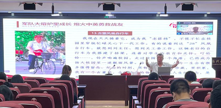刘方云老师,扬州大学关工委副秘书长,办公室副主任。1963年,刘老师参军入伍,在入伍后的第三年就光荣地加入共产党,参军四十余载,一腔热血不止先后当过班长、排长、指导员、团副政委,荣立三等功,并获得神炮手五好战士的荣誉称号。在抗美援越战争中,刘方云冒着生命危险从枪林弹雨救下身中三颗子弹的战友,四次与炸弹擦身而过……2003年,刘老师退居二线,到学校关工委工作虽已近八十高龄,每年仍参加几十场座谈会、报告会、老少共建等活动扬大关工委多次受到上级表彰,被评为市、省、全国教育系统及全国关心下一代先进集体,刘方云本人也多次获奖,成为扬大最鲜明一面旗帜以个人经历感染了一批又一批爱国青年学子,被同学们亲切的称为“小红帽爷爷”。