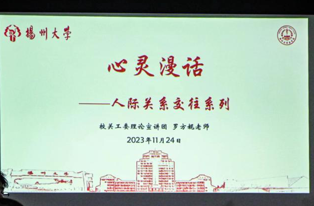 为了帮助同学们更好地了解人际关系交往方面的知识、缓解新生初入大学的不适应、解决人际交往方面的困惑,11月24日下午,学院邀请了校关工委理论宣讲团罗方妮老师在19号楼802会议室举办“心灵漫话——人际关系与交往系列”心理圆桌会活动。罗老师是国家三级心理咨询师,中国心理学会注册心理师、扬州大学心理健康中心兼职心理咨询师、南京大学心理健康教育与研究中心兼职心理咨询师。