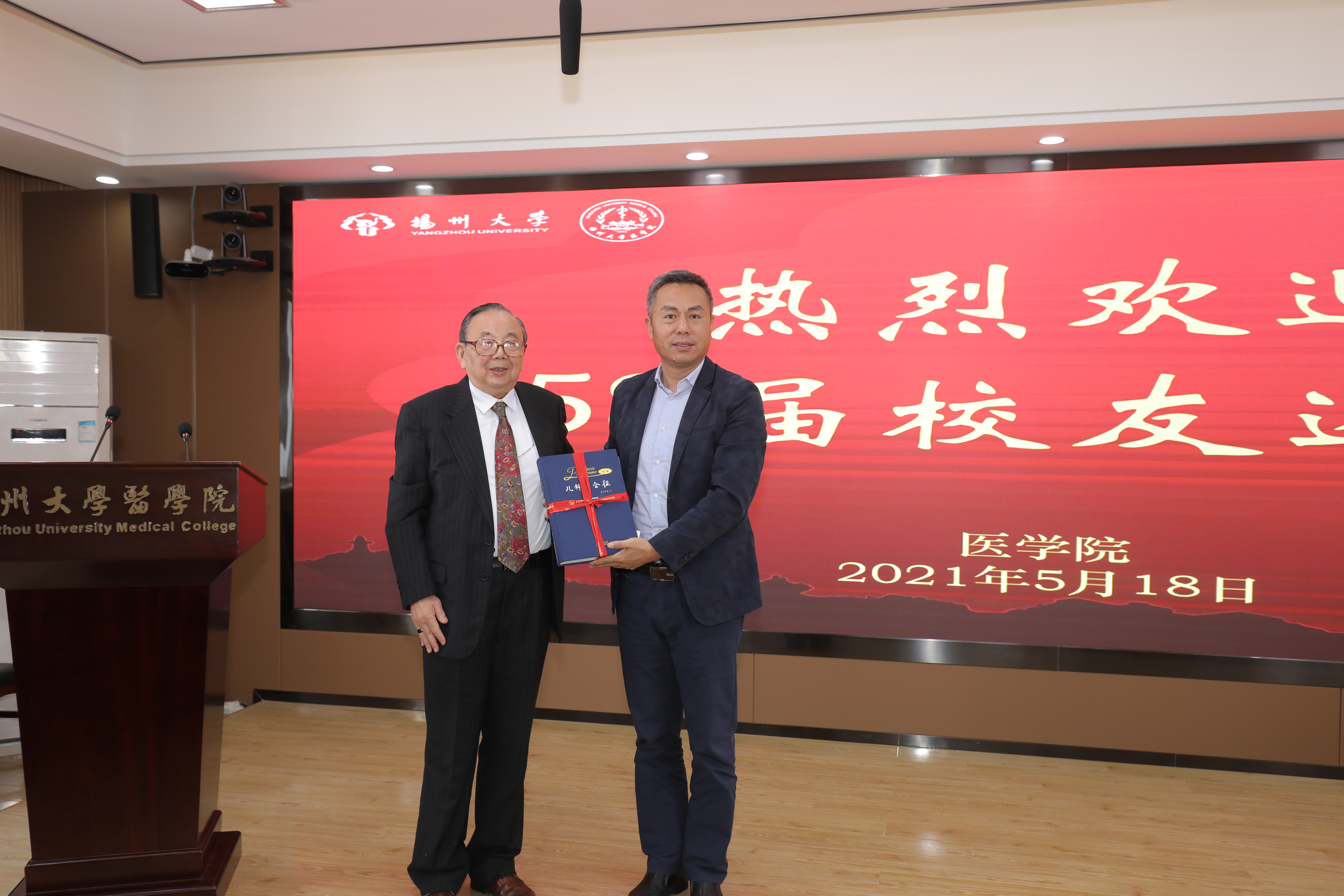 知名儿科专家洪庆成校友作为58级校友代表首先发言,他对母校的热情接待表示感谢。他回忆了校园里艰苦与热情并存的学习生活、恩师的谆谆教诲、同学之间友爱共进的难忘经历以及个人求学、工作的经历。他说,同学们毕业后纷纷响应国家号召,在医疗、教育一线等平凡岗位上默默奉献,做出了不平凡的事业。杨邦杰、宗文九、于载洋等校友也先后发言,表达各自的感想,回顾60年前毕业与揣着分配通知书奔赴工作岗位的情景。最后,洪庆成校友将其编著的《实用儿科新诊疗》《儿科综合征》,王方松校友将其编著的《呼唤医院心理卫生》《箴言心语》《健康靠自己》等书籍捐赠给母校,希望母校事业发展蒸蒸日上,祝愿母校的明天更美好!