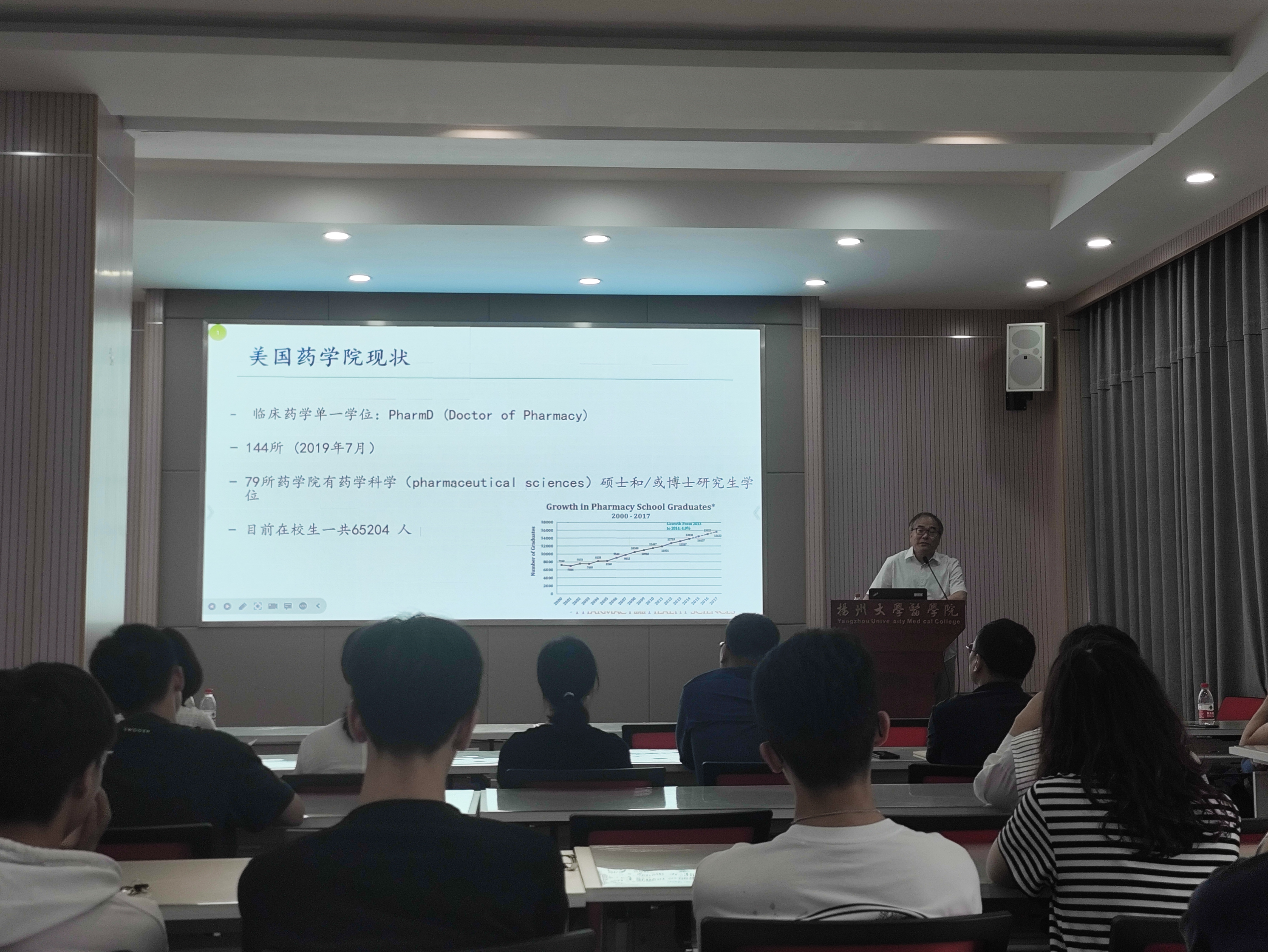 孙树森教授的讲座题目为《国际临床药学教育进展与趋势》。孙教授首先为大家介绍了美国药学相关专业学位的申请及入学情况,以及当前药学专业毕业生在美国的就业情况。之后,孙树森教授为大家详细介绍了当前国际临床药学教育与国内临床药学教育的主要差异,并着重讲解了美国临床药学专业的本科课程设置与毕业要求。最后,孙树森教授为我院未来药学人才的培养提出了宝贵建议。