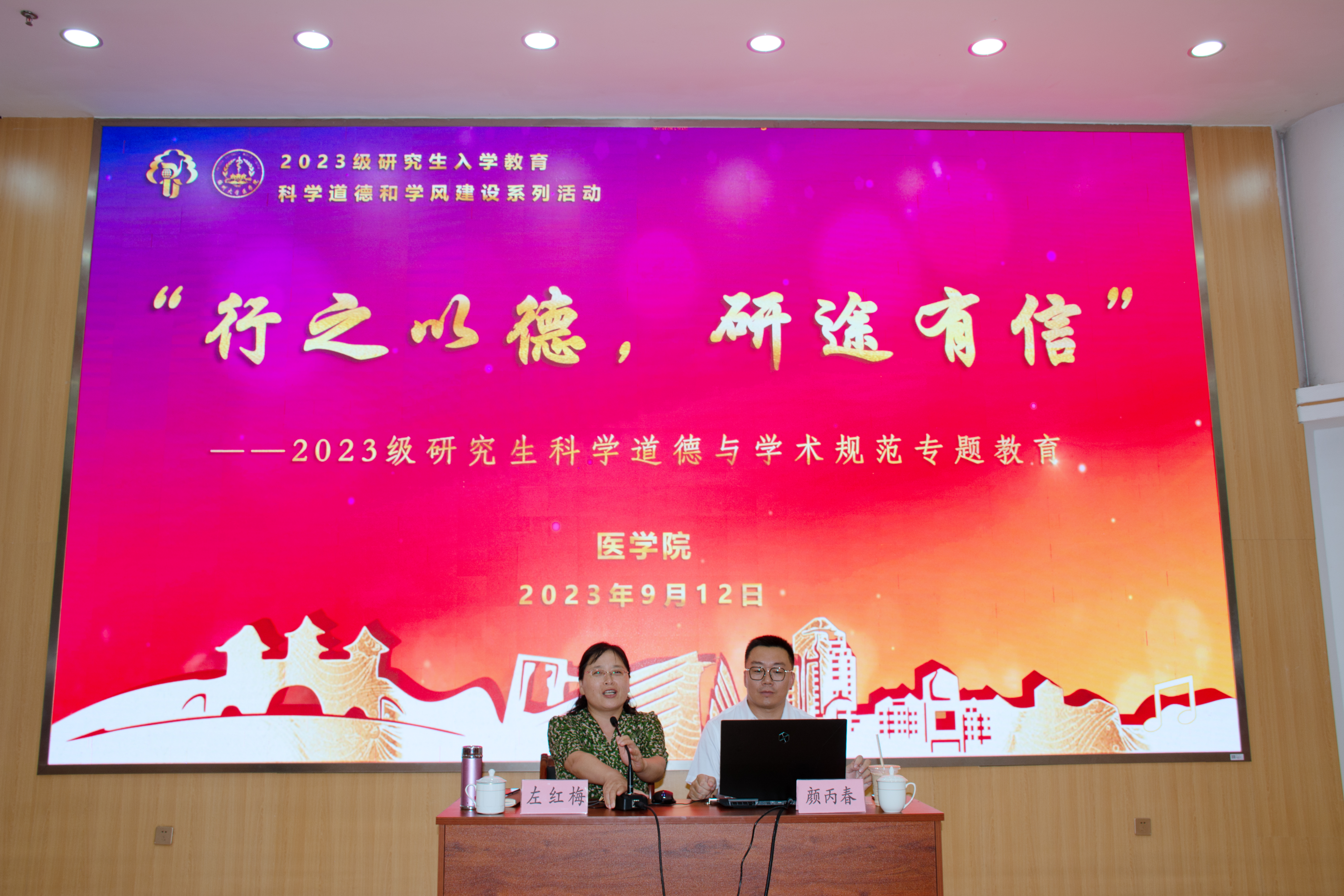 9月12日下午,医学院在逸夫图书馆报告厅举办2023级研究生入学教育——“行之以德,研途有信”科学道德与学术规范专题讲座。本次讲座由医学院党委副书记左红梅主持,副院长颜丙春主讲,2023级全体研究生共300余人参加讲座。