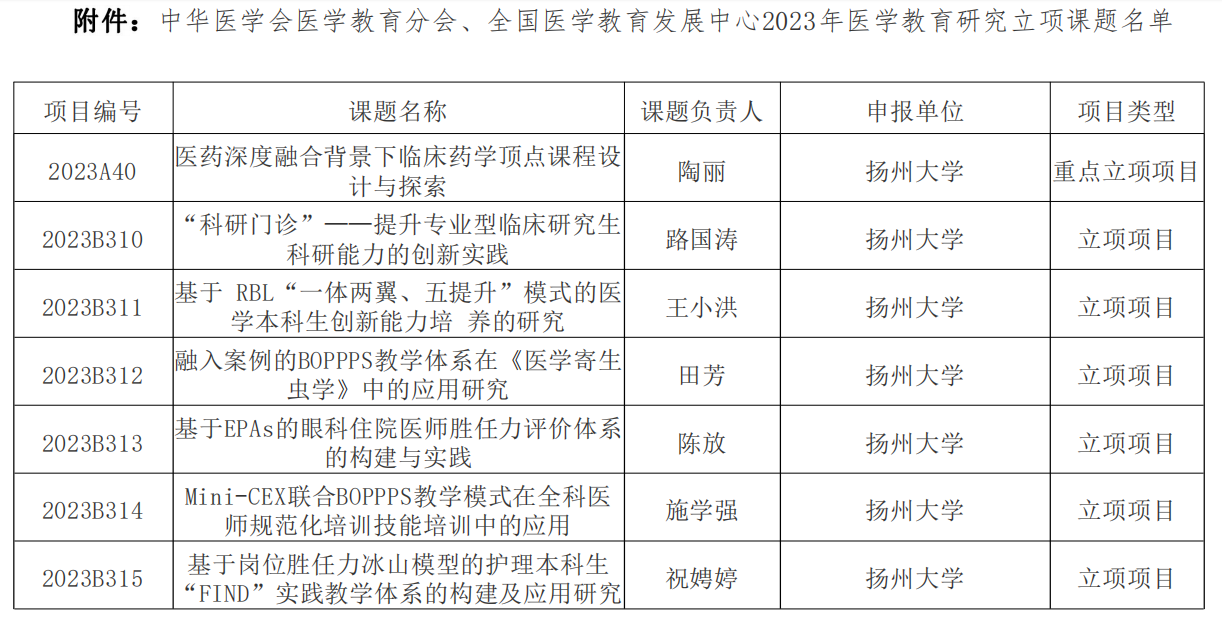 12月27日,中华医学会医学教育分会、全国医学教育发展中心公布了2023年度医学教育研究课题项目评审结果,我院陶丽老师获批重点立项课题(A类),王小洪、田芳、陈放三位老师获批立项课题(B类)。
