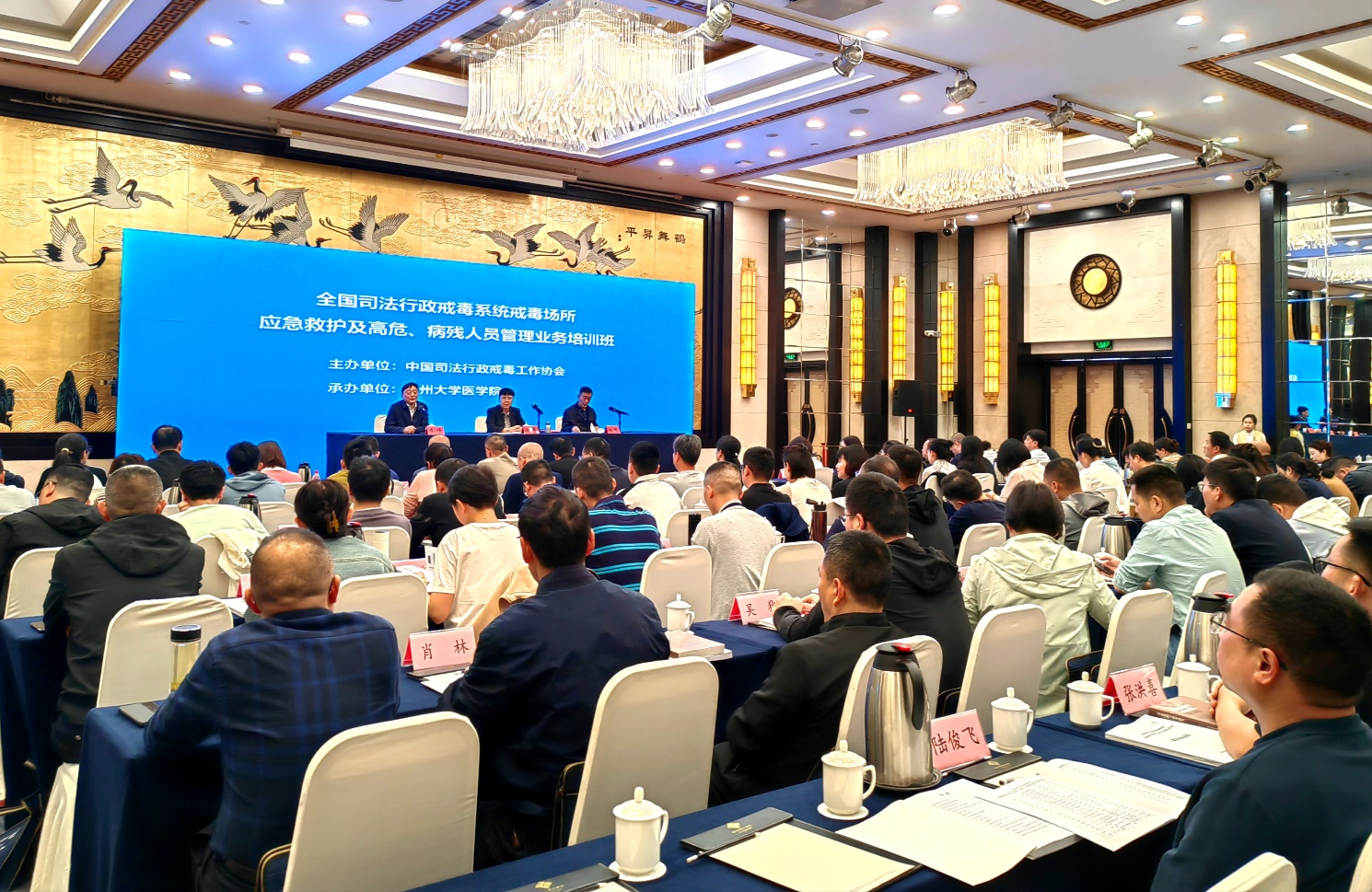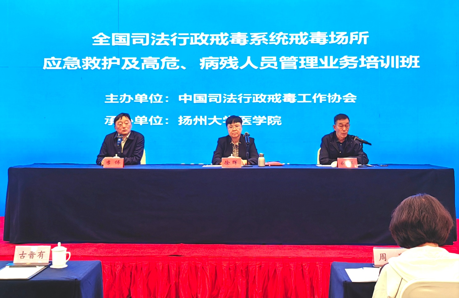 4月22日上午,全国司法行政戒毒系统戒毒场所应急救护及高危、病残人员管理业务培训班在扬州举行。中国司法行政戒毒工作协会党组副书记、副会长徐辉同志,中国司法行政戒毒工作协会原副会长张祥同志,扬州大学医学院副院长李伟同志等领导出席开班活动。会议由本次培训班中国司法行政戒毒工作协会驻培训基地领导张祥同志主持,来自全国25个省、市、自治区戒毒系统108名戒毒人民警察参加开班活动。