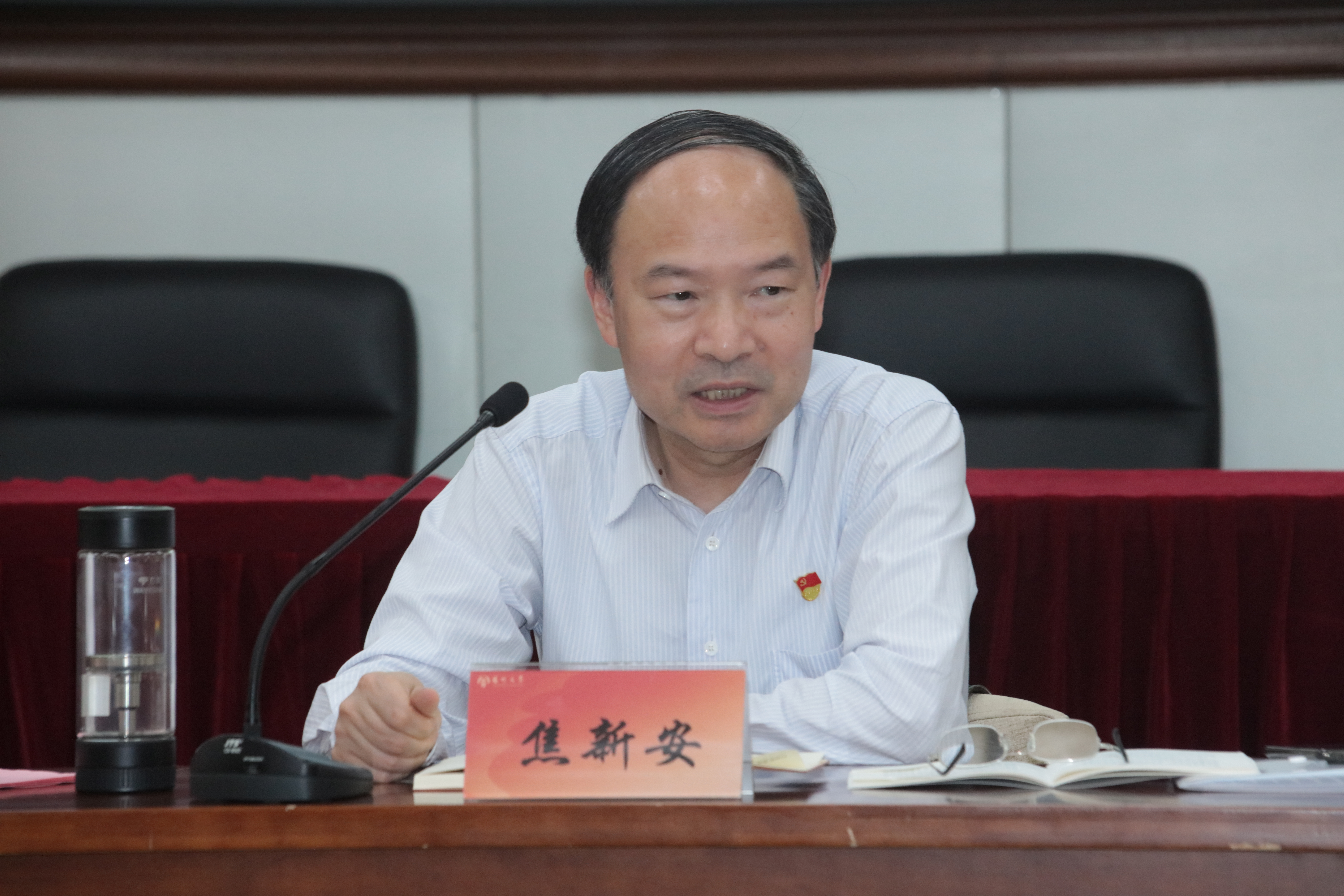 5月21日下午,医学院、商学院党委理论学习中心组党纪学习教育专题读书班在荷花池校区行政楼一楼报告厅举行联学共研学习会。校党委书记焦新安出席会议巡学旁听。