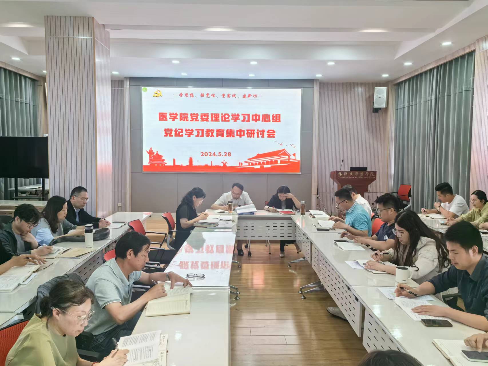 2024年5月28日下午,医学院党委理论学习中心组举行党纪学习教育读书班第五次集体研讨会,学习研讨了《中国共产党纪律处分条例》第二编分则(第八章对违反廉洁纪律行为的处分)及有关典型违纪案例。