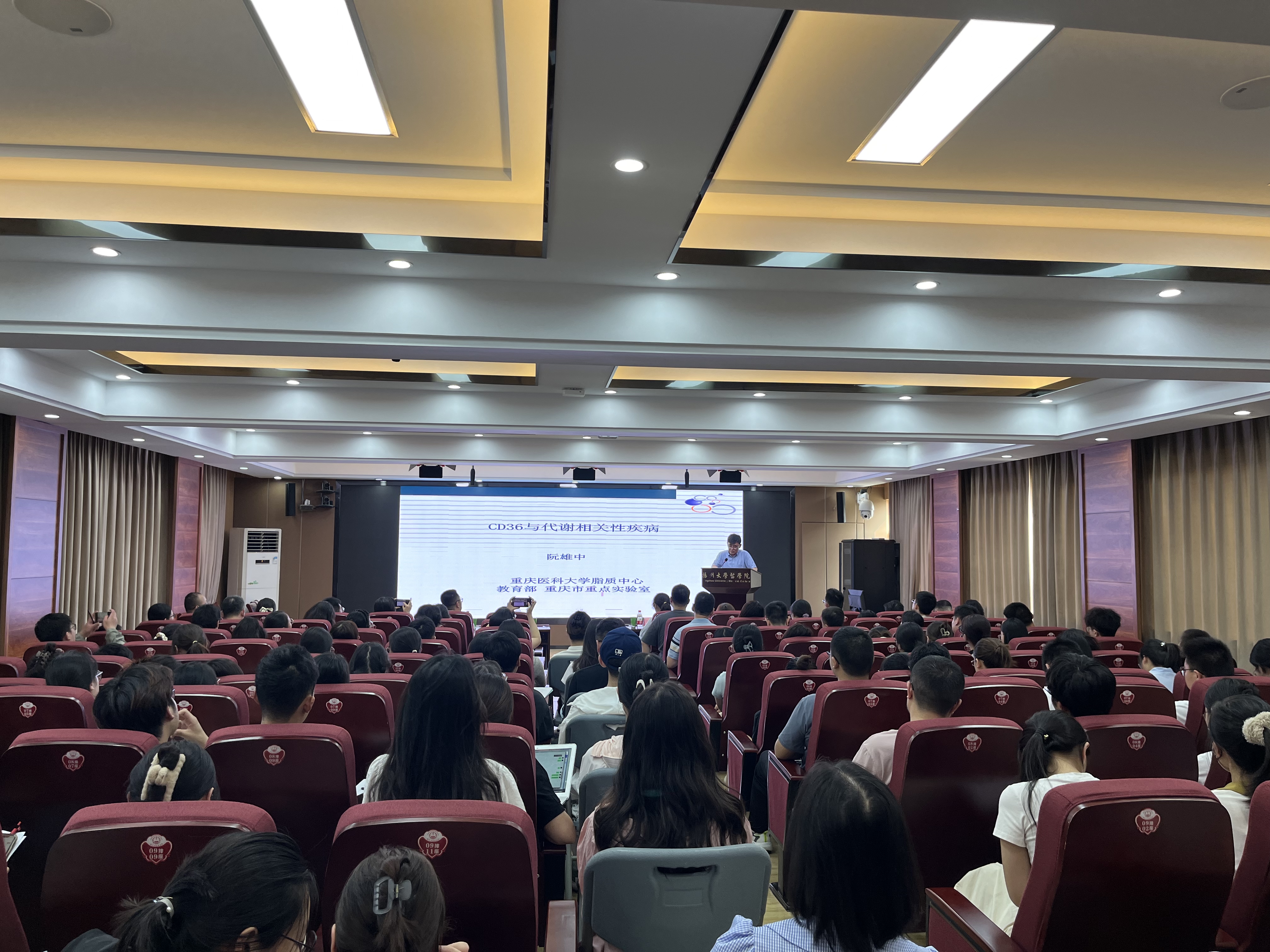 8月31日,重庆医科大学校长助理阮雄中教授在“医源论坛”作题为《脂肪酸转位酶CD36与代谢相关性疾病》的学术报告。副校长龚卫娟教授出席,报告由院长钱莉教授主持,学院师生140余人参加了报告会。