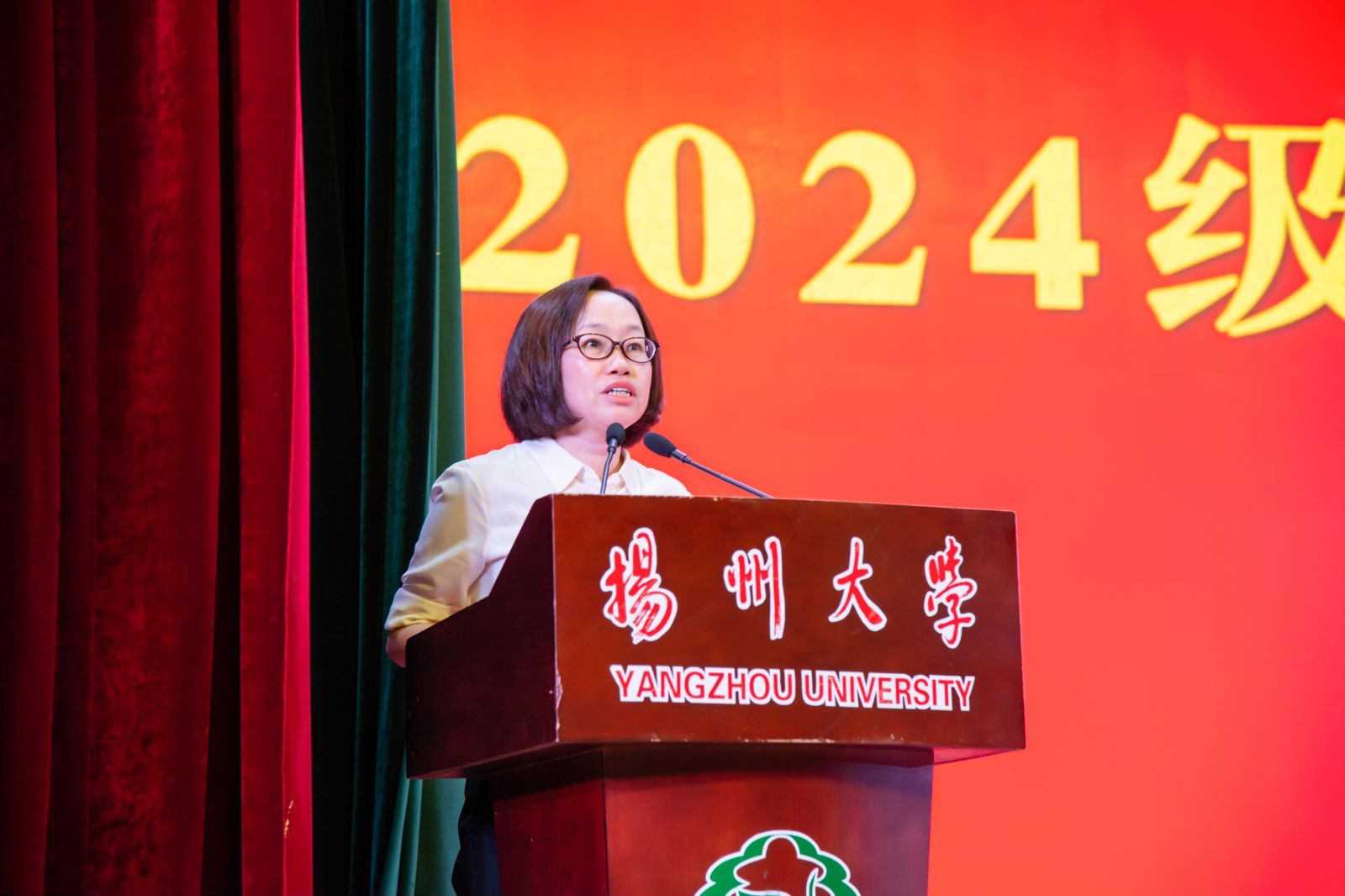 9月12日晚,医学院在文汇路校区大礼堂隆重举行2024年迎新大会。扬州大学副校长龚卫娟、院党委书记王庆林、院长钱莉、院党委副书记左红梅、副院长李伟、院综合办公室许金鑫、院团委书记(学工办主任)李丹阳,学院各学系领导,全体辅导员、2024级全体新生班主任老师以及2024级全体本科生与研究生参会。会议由院党委书记王庆林主持。