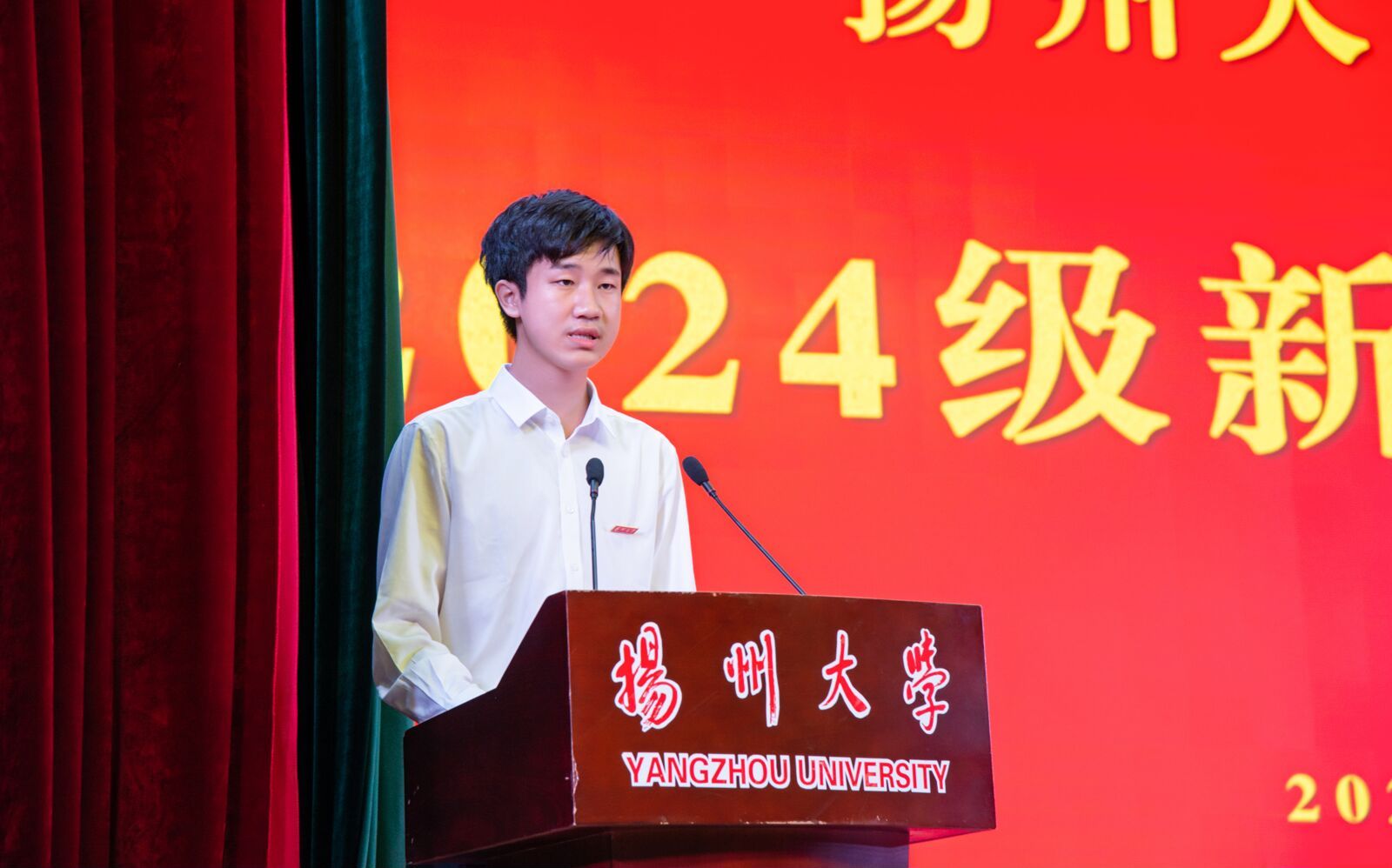 临床医学2409吴登云创新班的龙子坤同学代表全体新生向院领导、老师、学长学姐的关心与帮助表达了衷心的感谢,并表示自己将和所有新入学医学生一起,在“吴登云精神”的指引下,不断拼搏奋斗,成长为新一代以德为先、志存高远、开拓创新的扬医人!