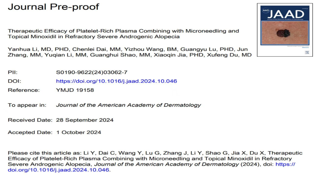 近期,我院临床医学系李燕华教授团队在享誉世界的皮肤科领域临床研究类顶刊《Journal of the American Academy of Dermatology》(Q1区,IF:12.8)上发表了题为“Therapeutic Efficacy of Platelet-Rich Plasma Combining with Microneedling and Topical Minoxidil in Refractory Severe Androgenic Alopecia” 的临床研究性论文,首次探讨了自体富血小板血浆(PRP)、微针技术和外用米诺地尔联合应用于难治性严重雄激素性脱发(AGA)患者的疗效,并探讨了该联合技术具体改善毛囊结构和促进毛发生长的机制主要涉及的生物学过程。