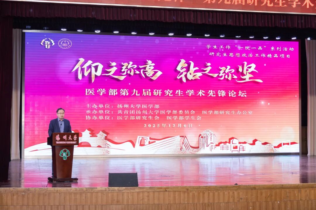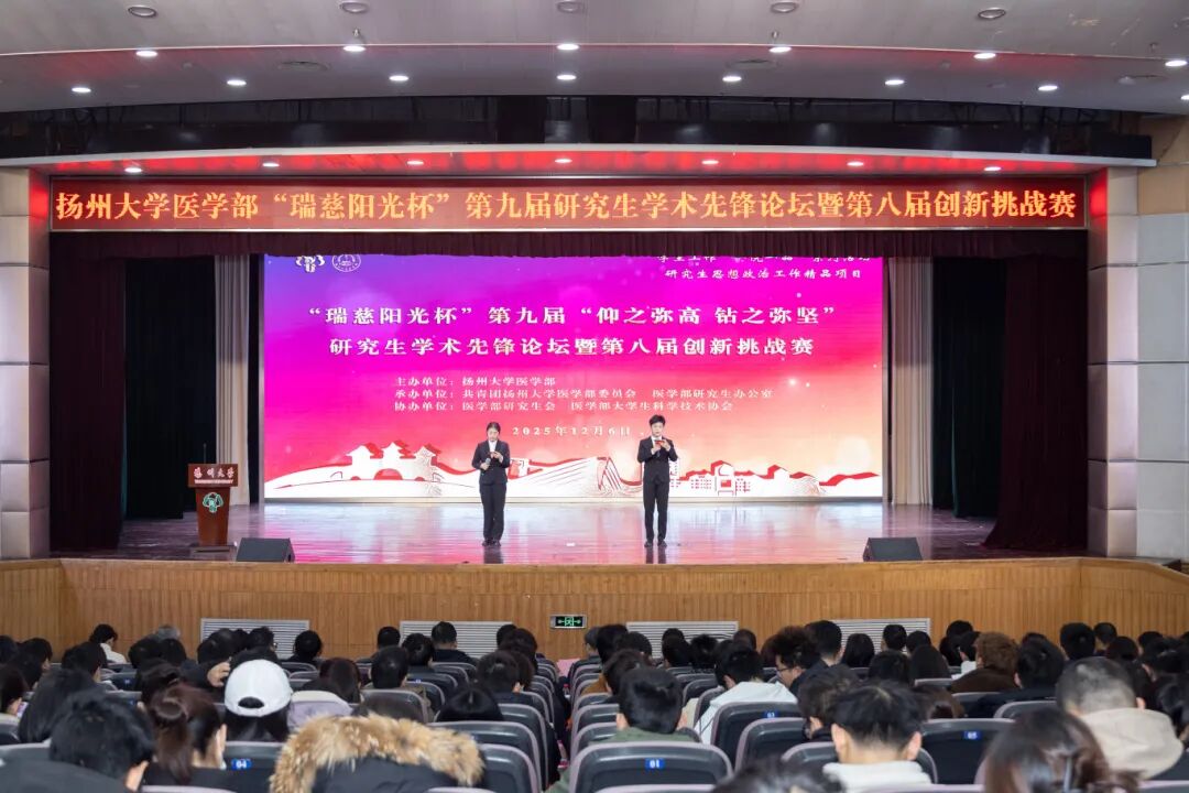 12月6日上午,扬州大学医学部在荷花池校区大学生活动中心二楼多功能厅、三楼小剧场举行“瑞慈阳光杯”第九届研究生学术先锋论坛暨第八届创新挑战赛。校党委常委、副校长韩杰,校党委常委、宣传部部长张信华,校教务处处长钱莉,校党委研究生工作部部长郑刚,校招生就业处处长陈轶群,校党委保卫部部长、保卫处处长毛连军,校团委书记毕亮,校研究生院副院长汪小会,校党委学生工作部副部长、学生工作处副处长周超,医学部党委书记吕红梅、常务副主任梁景岩、党委副书记王志健,基础医学院·公共卫生学院党委书记廖善光、院长陆凤,中医药学院党委书记高静及导师代表、研究生办公室全体老师、团委(学工办)全体辅导员和24级、25级本研学生出席活动。