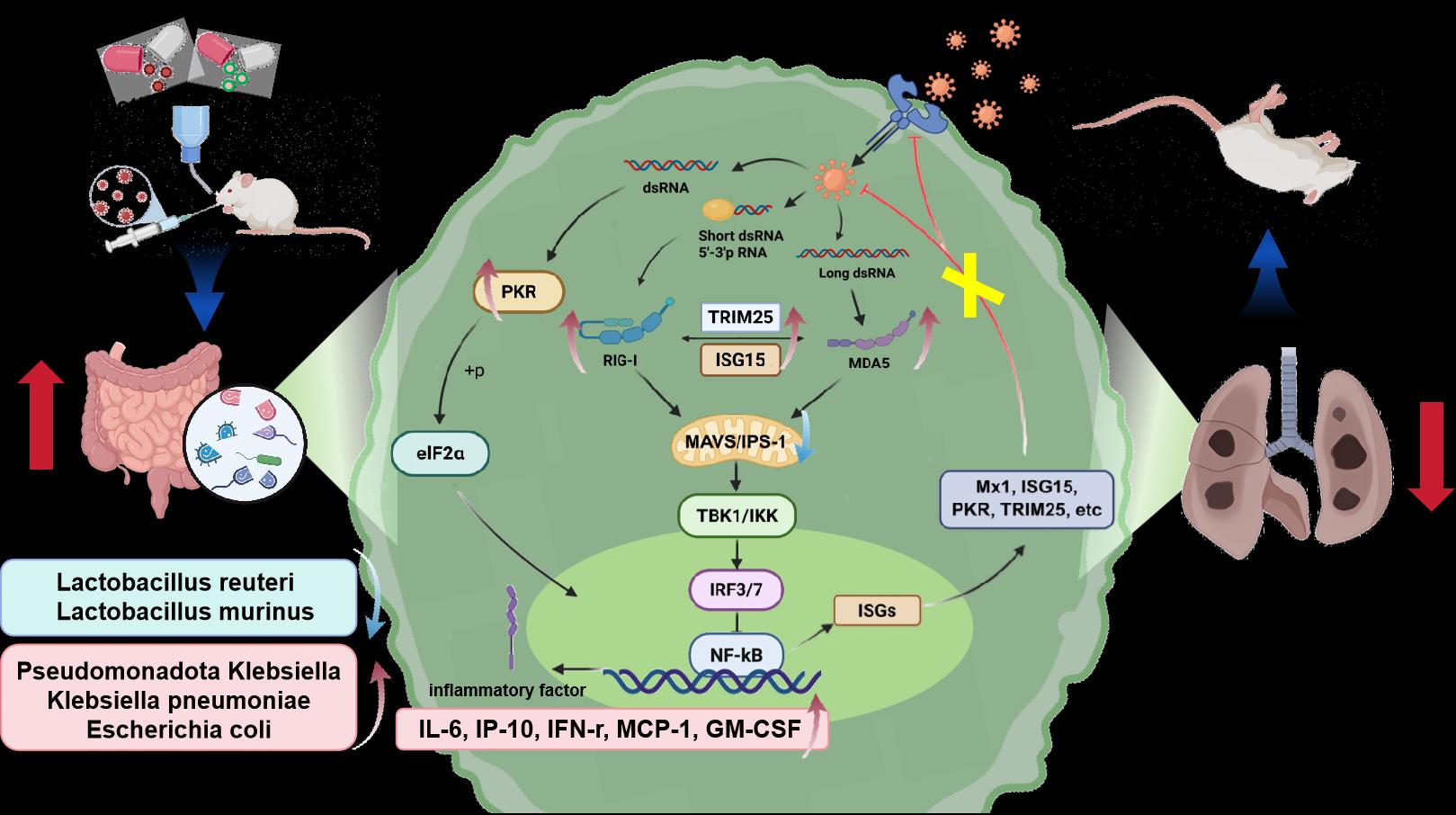 近日,扬州大学医学部中医药学院抗病毒感染药物研发团队张评浒教授携手兽医学院王晓泉教授、基础医学院李国才教授等科研团队,在国际权威期刊《Gut Microbes》发表题为《The Potential Immunological Mechanisms of Gut Microbiota Dysbiosis Caused by Antibiotics Exacerbate the Lethality of Influenza Viruses》的研究论文。本研究以H1N1流感病毒感染小鼠为模型,系统探究了抗生素不同干预模式对肠道菌群结构、流感病毒致病性、肺-肠抗病毒免疫通路及抗病毒药物疗效的影响,深入阐明了抗生素干预影响流感病情进展的核心免疫机制,首次从抗病毒免疫角度科学阐明了抗生素不宜随意用于治疗流感的机理,也为临床如何合理使用抗生素防治流感提供了科学依据。本科生朱佳宁、黄子行、林颖、闵锐和硕士研究生朱洁为论文第一作者,本科生万子博、陈玉婷、祝建雯、邢丽、李盛及外籍博士后Chinasa Valerie Olovo也参与了本项研究,王晓泉教授、李国才教授、张评浒教授为共同通讯作者。
