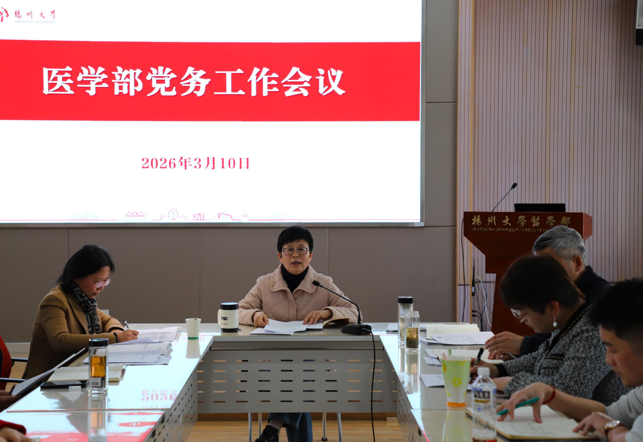 3月10日下午,扬州大学医学部在路北校区19号楼9楼报告厅召开党务工作例会。学部及下辖学院党委领导,全体党支部书记参加会议,会议由医学部党委书记吕红梅主持。