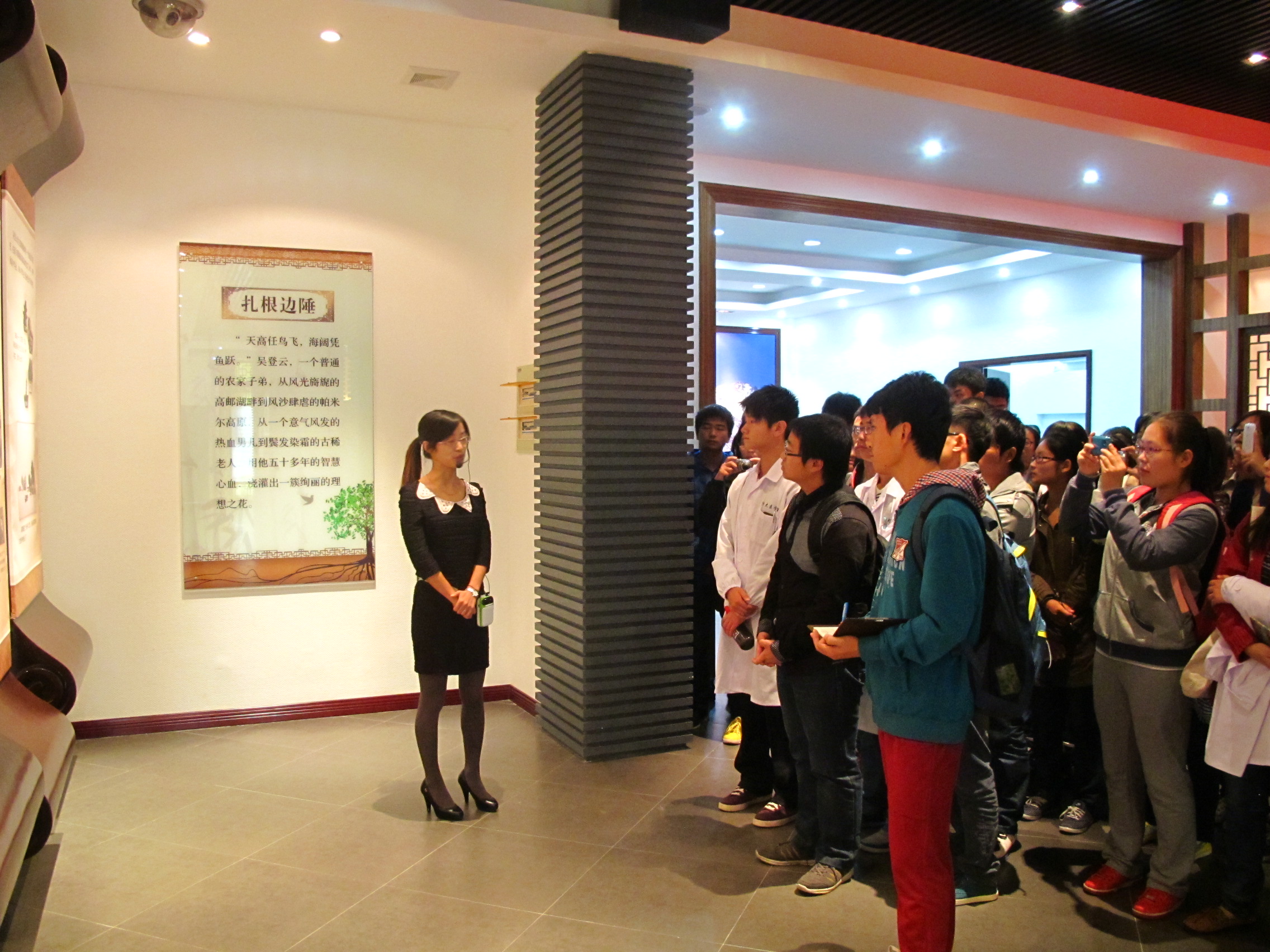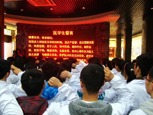 进入展览馆,名为“扎根边陲、立志创业、真爱无疆、赤子情深、感动中国”的五个展厅,以画卷、照片的形式向人们展示了吴登云的生活和工作轨迹,陈列着的荣誉证书、获奖奖杯,以及各级报刊宣传吴登云的报道,集中体现了吴登云不怕吃苦,舍己为人的奉献精神。参观完展厅之后,由张华同学带领大家进行医学生誓言宣誓,“我志愿奉献医学,热爱祖国,服务人民……”,庄重的宣誓,体现了扬医学子不怕辛苦,立志学医的坚定决心。