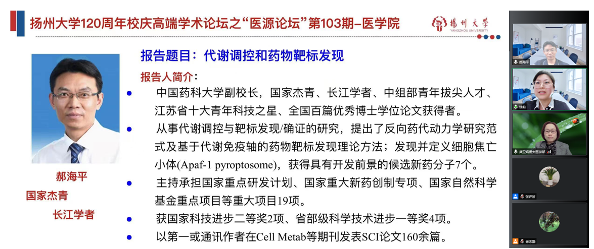 5月11日下午,中国药科大学副校长,国家杰青、长江学者、中组部青年拔尖人才、全国百篇优秀博士学位论文获得者郝海平教授应邀走进“建校120周年高端学术论坛”医学院第103期“医源论坛”,为我校师生作题为“代谢调控和药物靶标发现”的专题报告,钱莉副院长主持报告会。