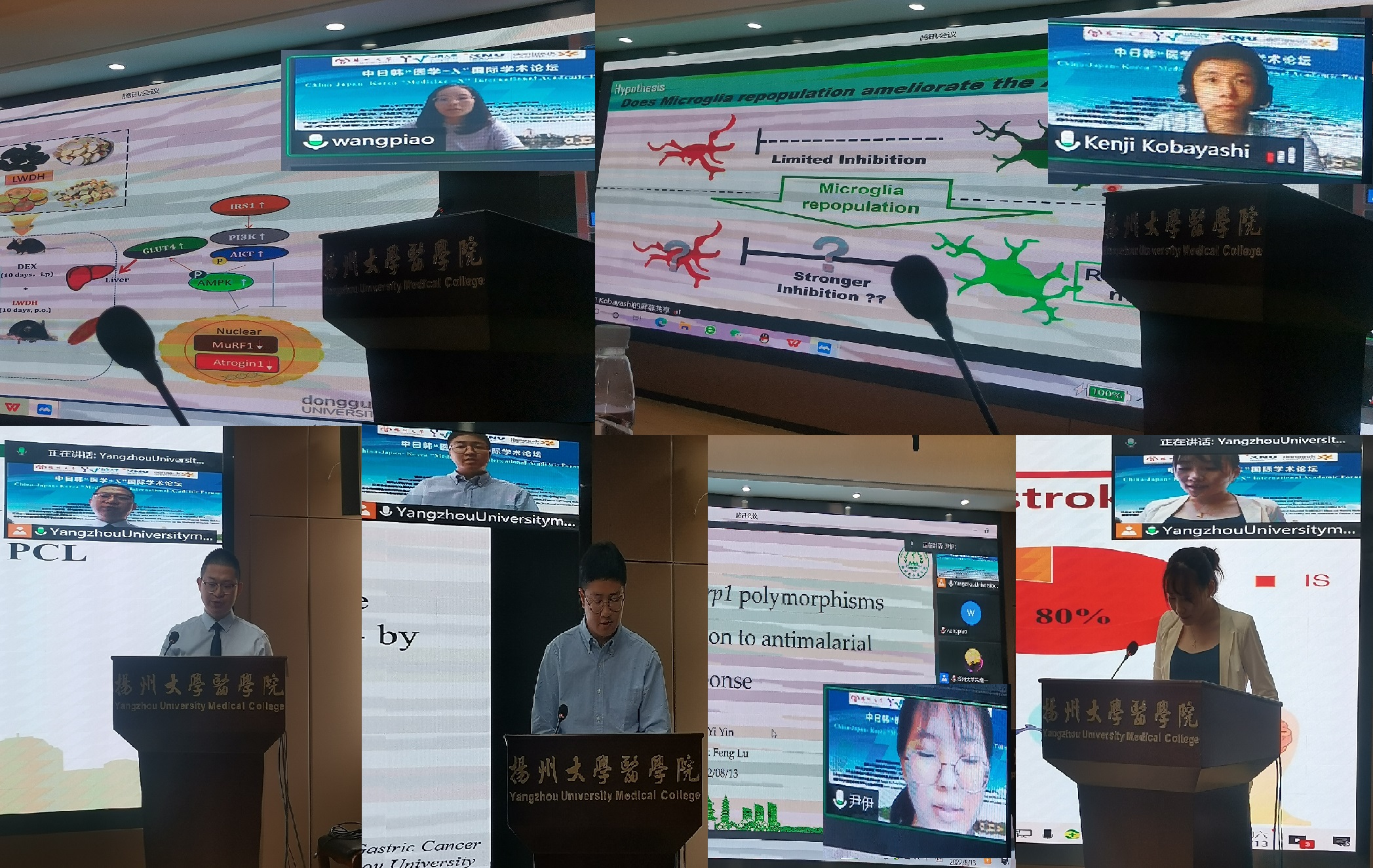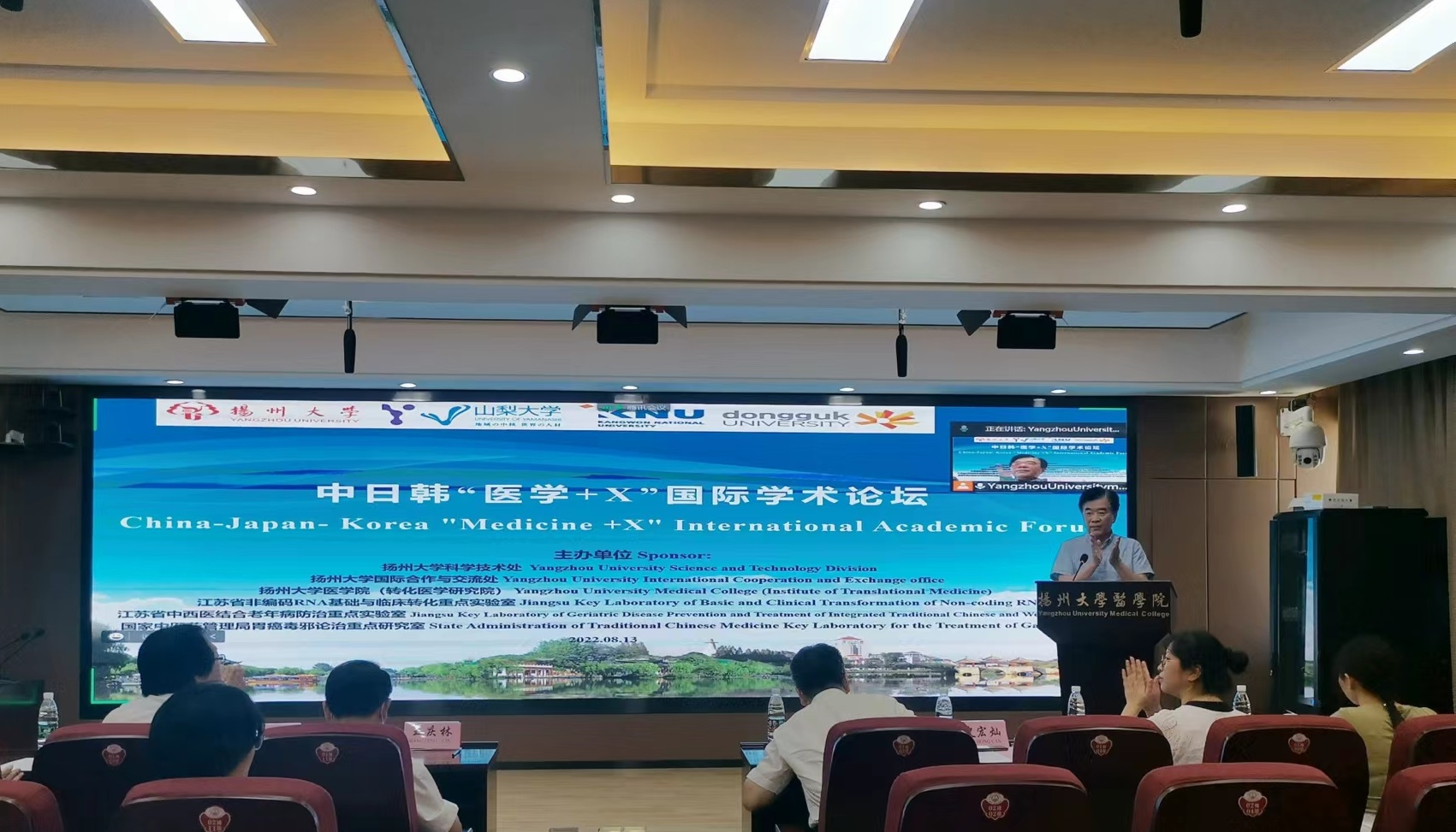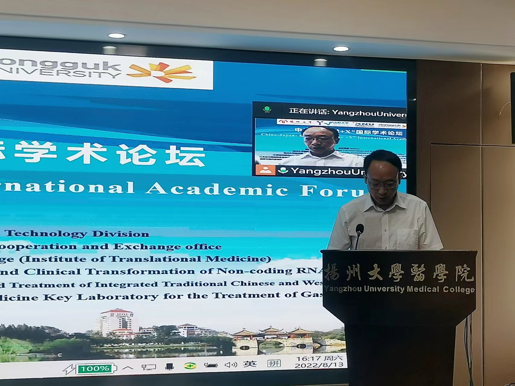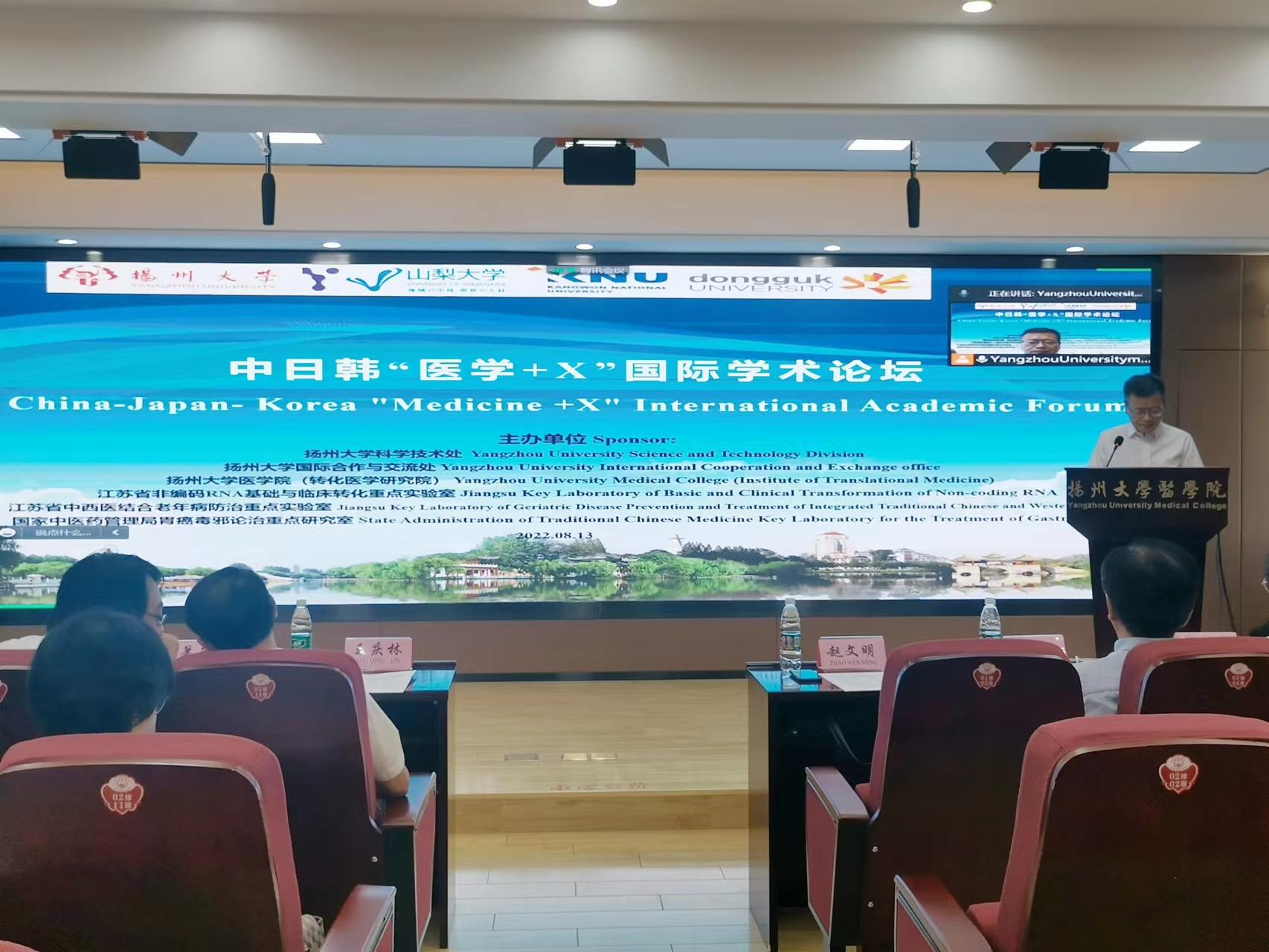 8月13日,由扬州大学科学技术处、国际合作和交流处、医学院(转化医学研究院)、江苏省非编码RNA基础与临床转化重点实验室、江苏省中西医结合老年病防治重点实验室及国家中医药管理局“胃癌毒邪论治”重点研究室主办的中日韩“医学+X”国际学术论坛隆重召开。本次论坛采用线上线下相结合的方式,来自海内外共200余人参加了本次会议。扬州大学副校长赵文明出席并致开幕词。医学院王庆林书记出席并致闭幕辞,医学院院长史宏灿教授主持了开幕式。医学院钱莉副院长、转化医学研究院常务副院长梁景岩以及医学院各系的系领导出席了论坛。