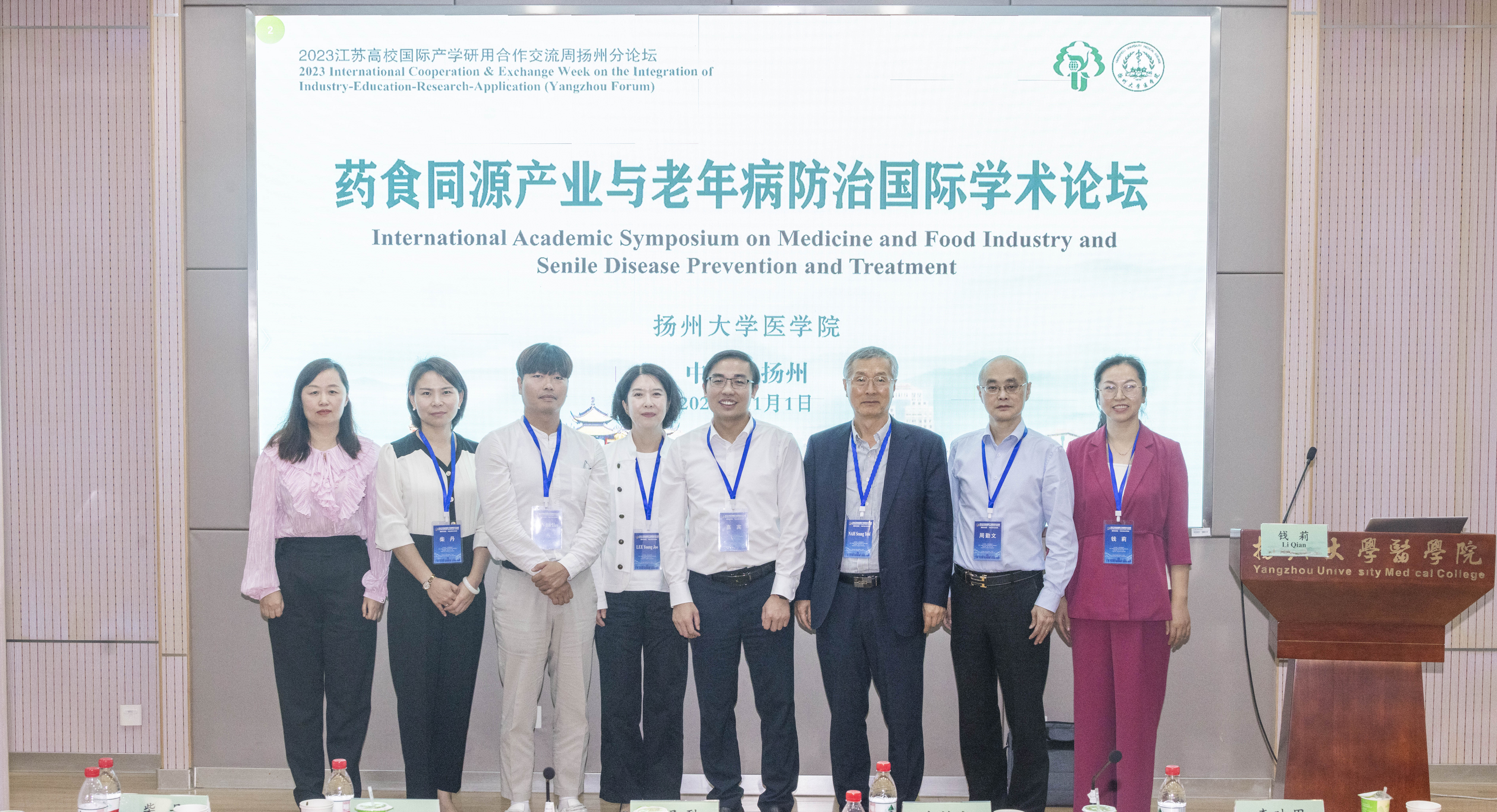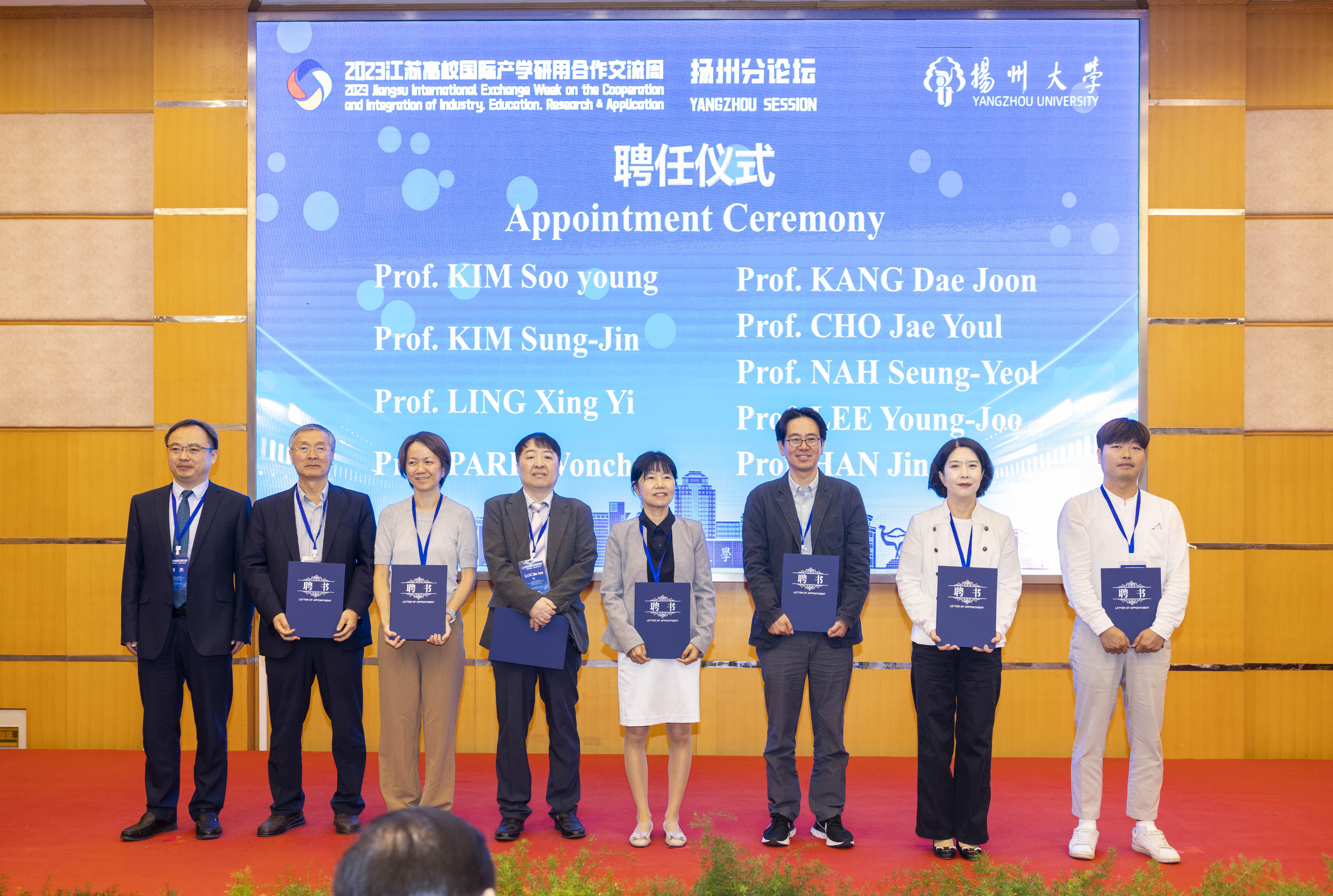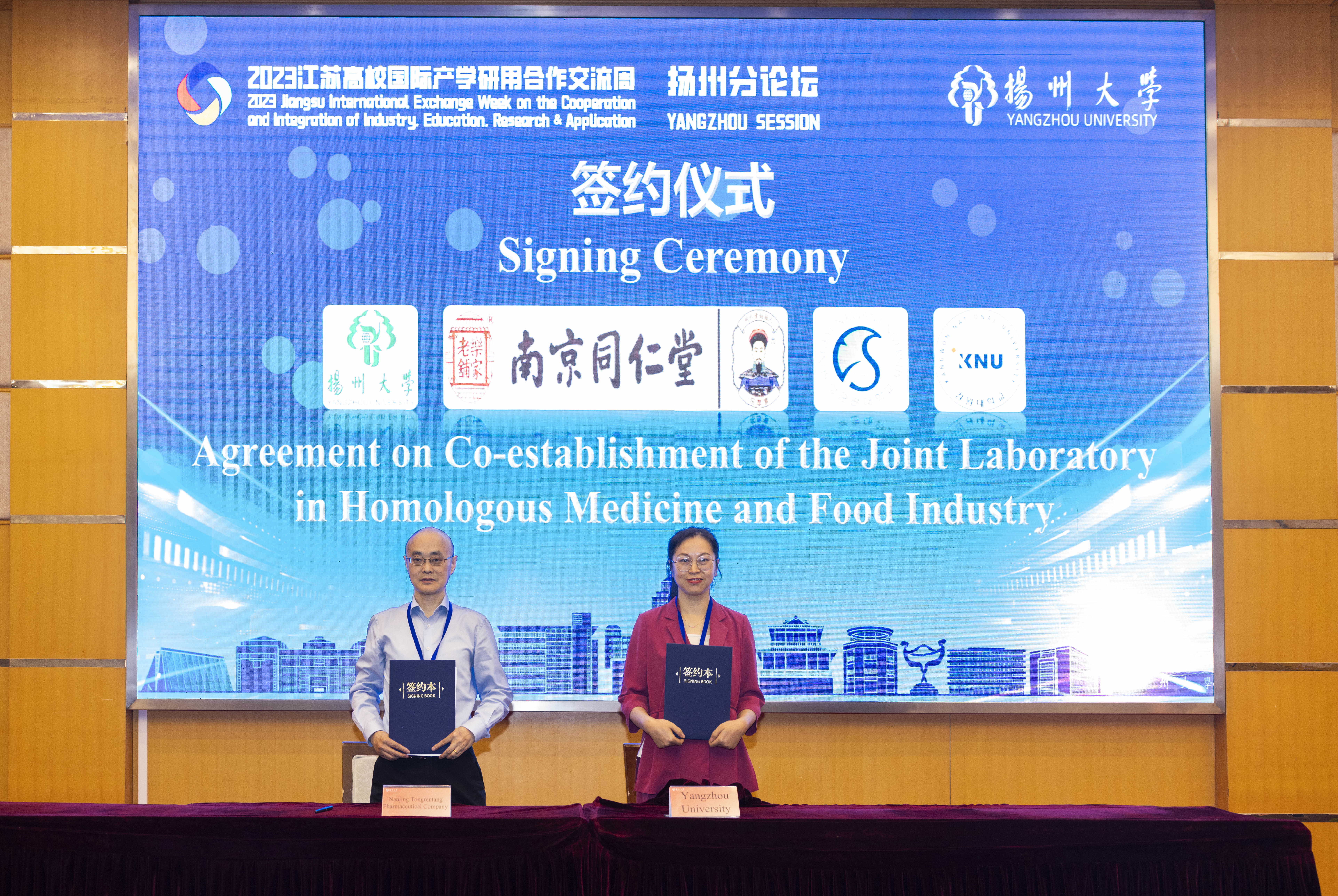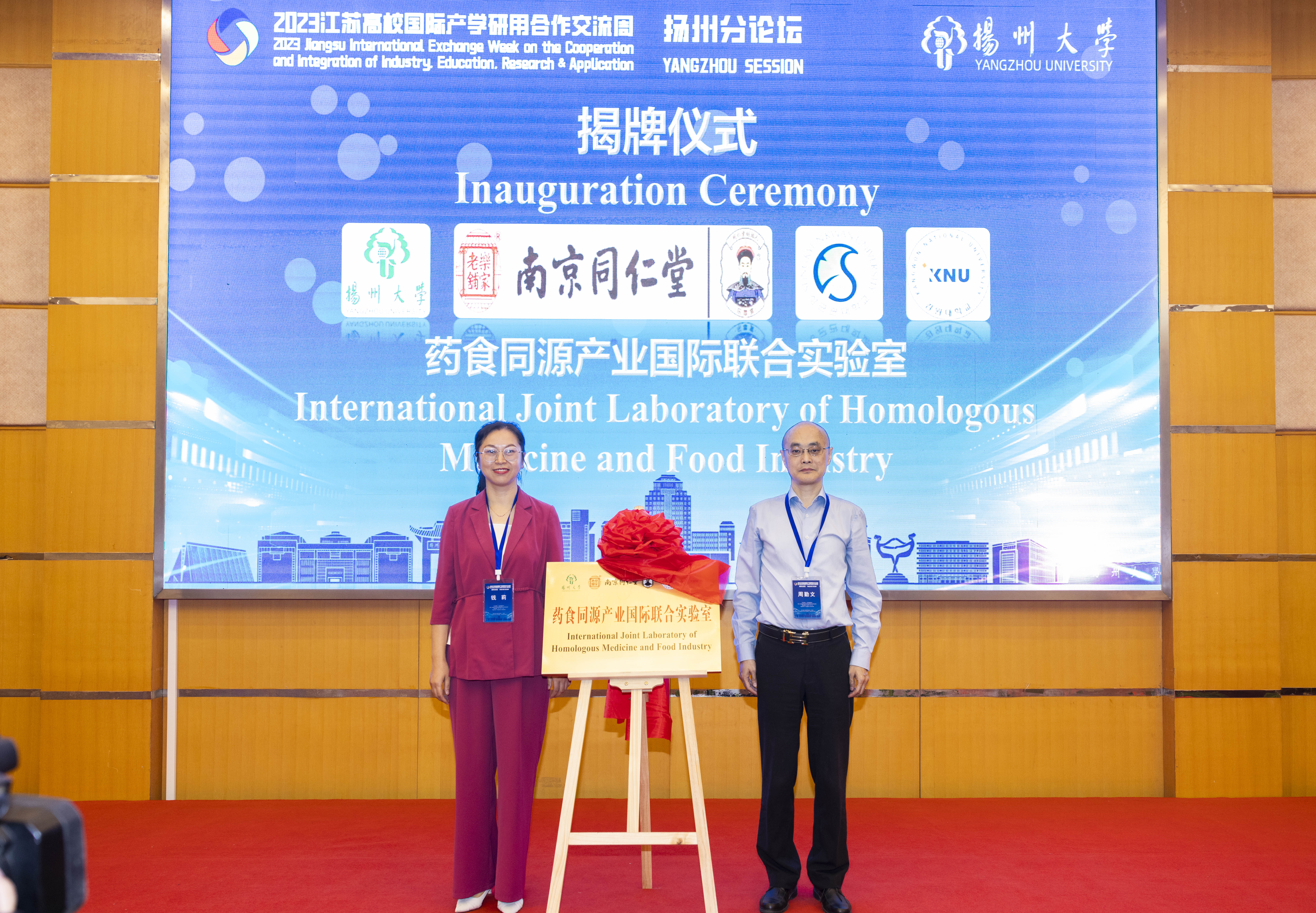 本次论坛是由省教育厅主办的2023江苏高校国际产学研用合作交流周的重要内容之一。开幕式上,我院与南京同仁堂药业有限公司、韩国成均馆大学、韩国江原大学成立了“药食同源产业国际联合实验室”,签署了合作协议并揭牌。我院邀请的来自韩国的3位专家被聘为扬州大学国际联合培养博士生导师。