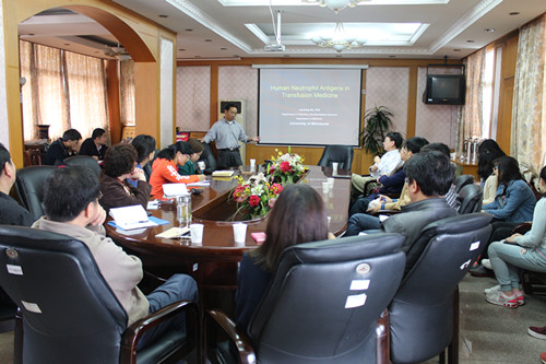 4月29日上午,扬州大学校友,美国明尼苏达大学吴建明教授在医学院行政楼四楼会议室应邀为我院研究生和科研教师作了题为 Human Neutrophil Antigens in Transfusion Medicine;和 Genetic roles of IgG Fc Receptors in Human Autoimmune Diseases的学术报告,医学院副院长张育教授,龚卫娟教授出席报告会。