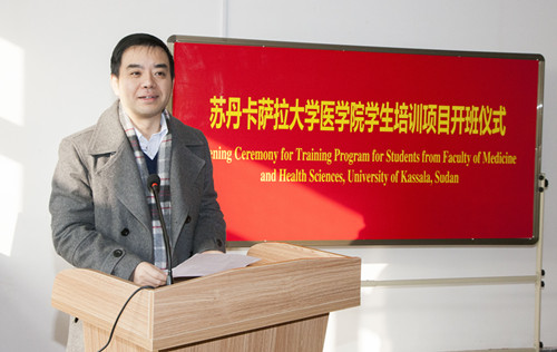 仪式上,陈校长首先代表扬州大学向远道而来的苏丹学员表示热烈的欢迎,陈校长简单介绍了扬州大学的办学历史、学科建设以及留学生教育现状,并预祝此次培训班圆满成功。随后,医学院副院长王正兵致辞,介绍了医学院的学科概况并再次向学员表达欢迎。最后,卡萨拉大学项目负责人Yasser Hassan Osman发表讲话,表达了对扬州大学热情接待的感谢。