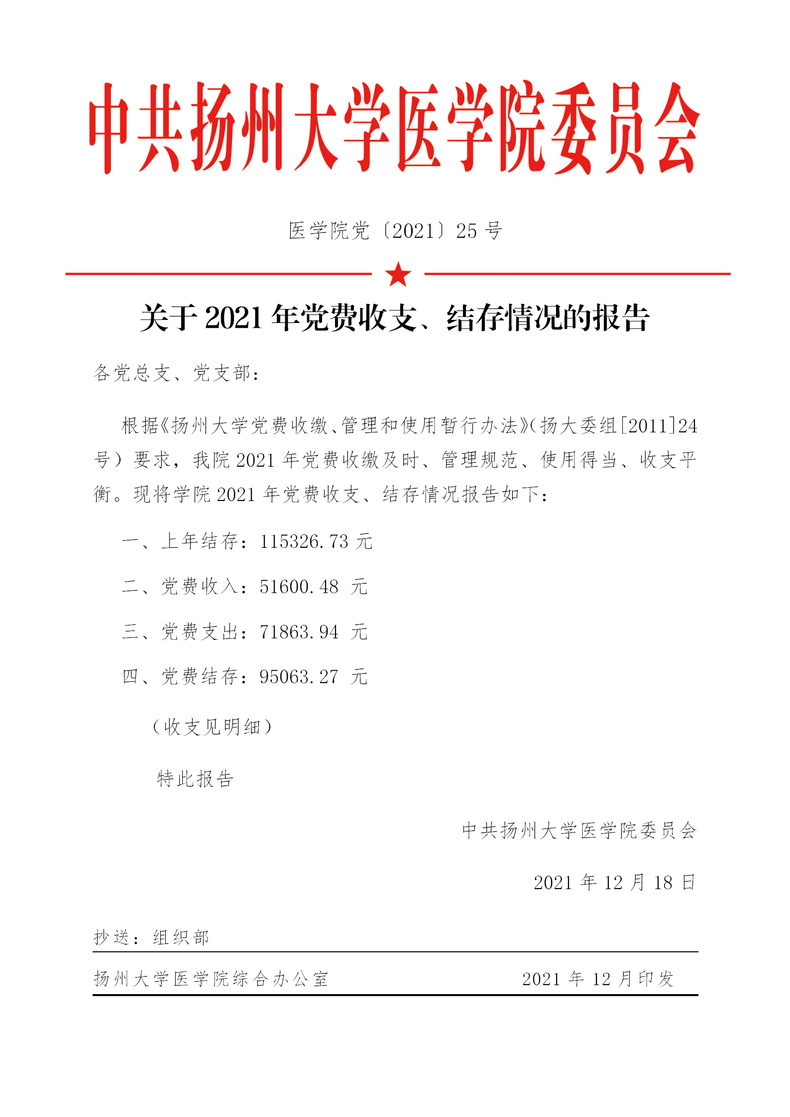 关于2021年党费收支、结存情况的报告(医学院党〔2021〕25号)
