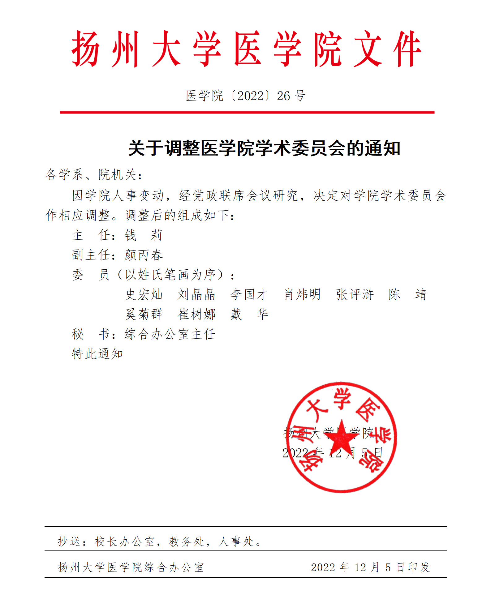 关于调整医学院学术委员会通知(医学院〔2022〕26号)