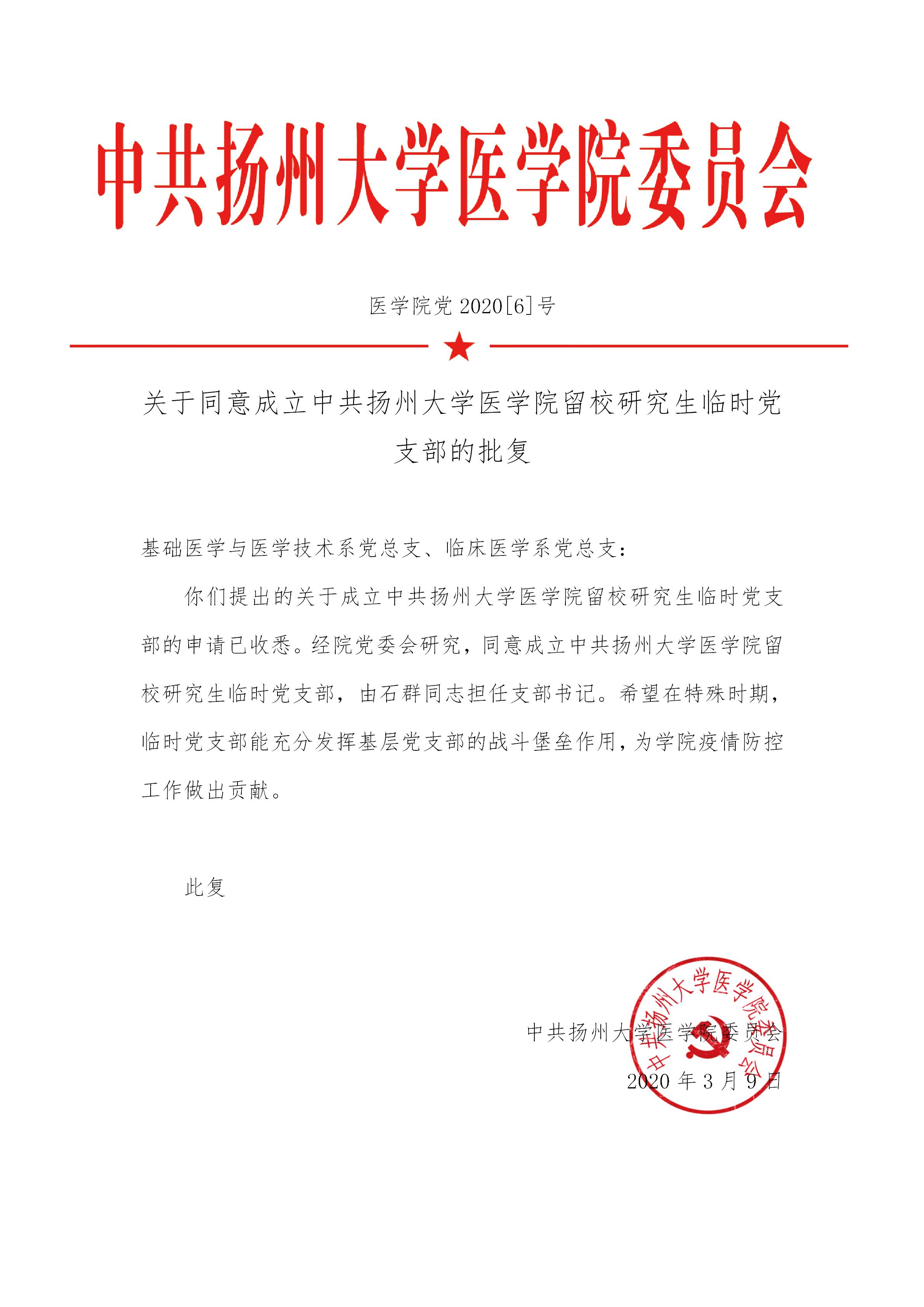 关于同意成立中共扬州大学医学院留校研究生临时党支部的批复